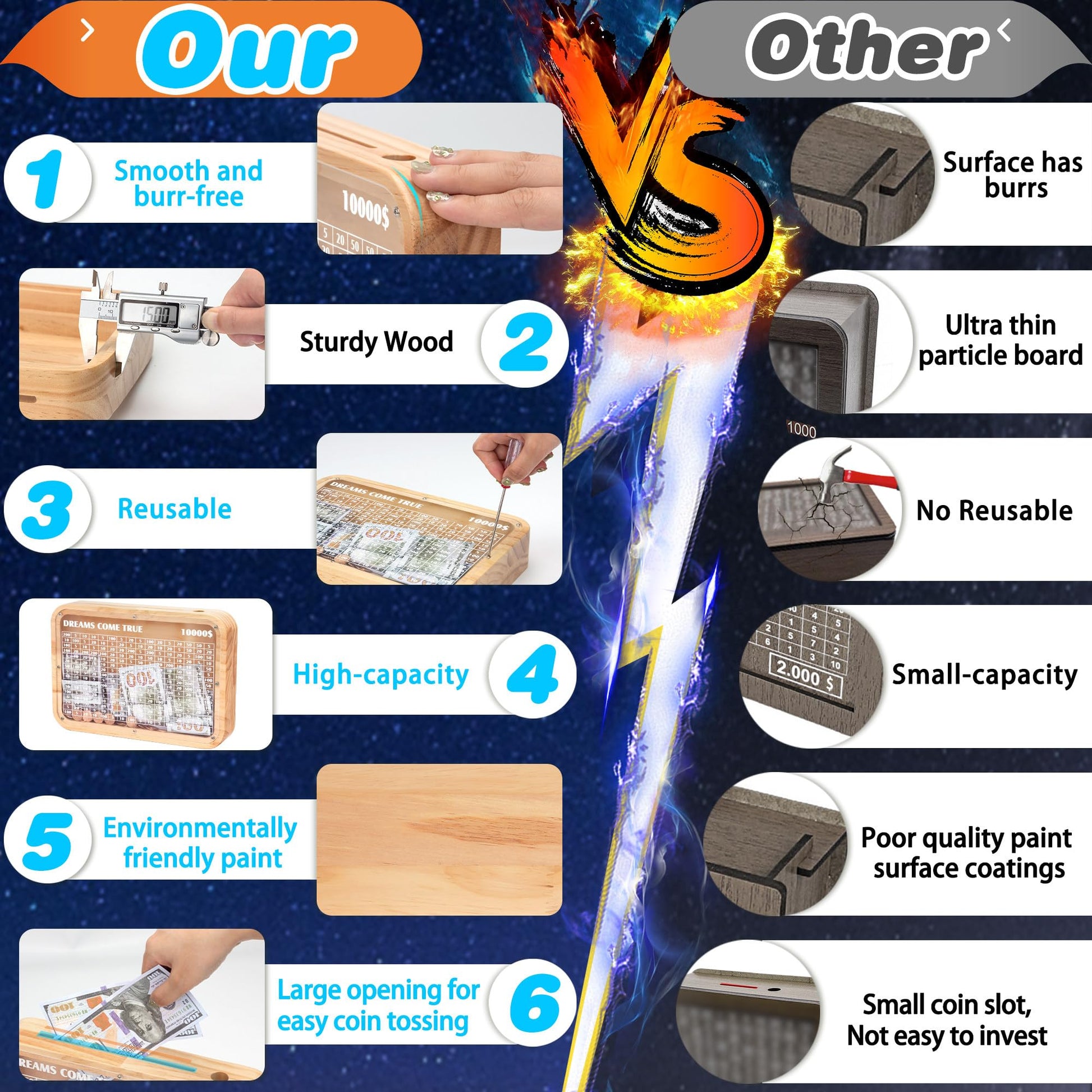 ??Unique Design: This Target Money Storage Jar Combines Wood And Transparent Acrylic Panels, Not Only Presenting A Unique Appearance, But Also Showcasing A Warm Wooden Texture And Modernity. No Assembly Required, Can Be Used Directly, With A Smooth And Burr Free Feel, Safe And Environmentally Friendly, Lightweight And Comfortable. | ??Family Significance: This Piggy Bank Is Not Only A Tool For Personal Savings, But Also A Symbol Of Shared Family Goals. Family Members Jointly Determine The Purpose Of Savings, Work Together To Save, And Make Every Investment Meaningful And Full Of Unity. | ??Incentive Savings: By Setting Clear Goals And Storing Change And Banknotes In Them, Gradually Accumulating, It Motivates You To Continue Saving. The Saved Money Can Help You Achieve A Series Of Meaningful Things, Such As Traveling, Purchasing Desired Items, Or Other Dreams. At The Same Time, Its Minimalist Design And High-Quality Materials Make It A Fashionable Decoration For Homes Or Offices | ??Convenient And Practical: This $10000 Savings Box Has An Easy-To-Use Coin Slot, Making It Easy To Deposit Paper And Coins. In Addition, It Is Equipped With A Clear Display Screen With Recordable Markings, Making It Easy To Mark And Clear, While Displaying The Amount Of Savings, Allowing You To Keep Track Of The Progress Of Savings At Any Time. | ??Intentional Gift: As A Gift, This Piggy Bank Is Both Practical And Meaningful. Giving Gifts To Family And Friends Not Only Provides Them With A Place To Store Their Belongings, But Also Conveys Your Blessings For Their Dream Realization In Every Savings. In Addition, It Is Suitable For Giving To Family And Friends On Birthdays, Holidays, Or Other Special Occasions.