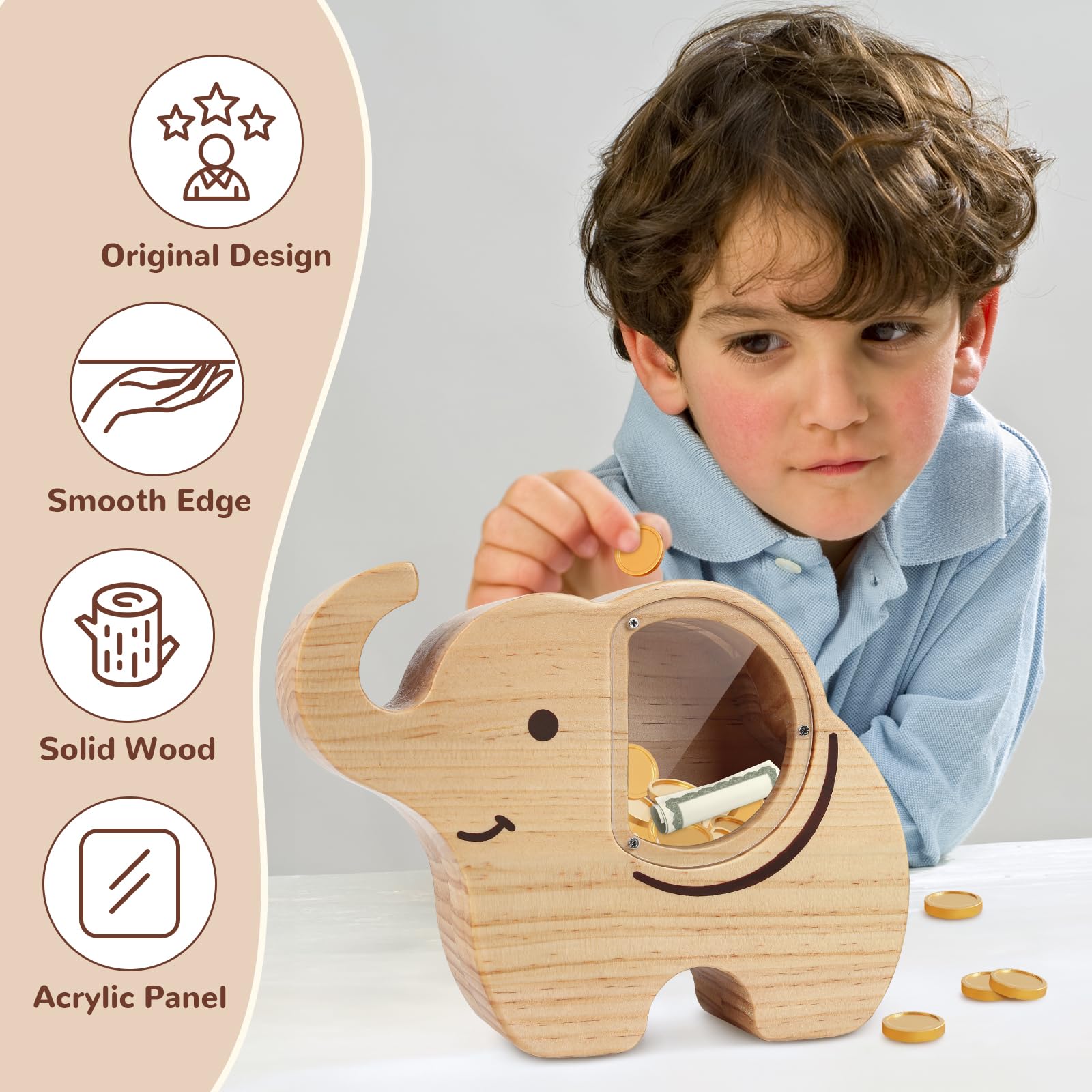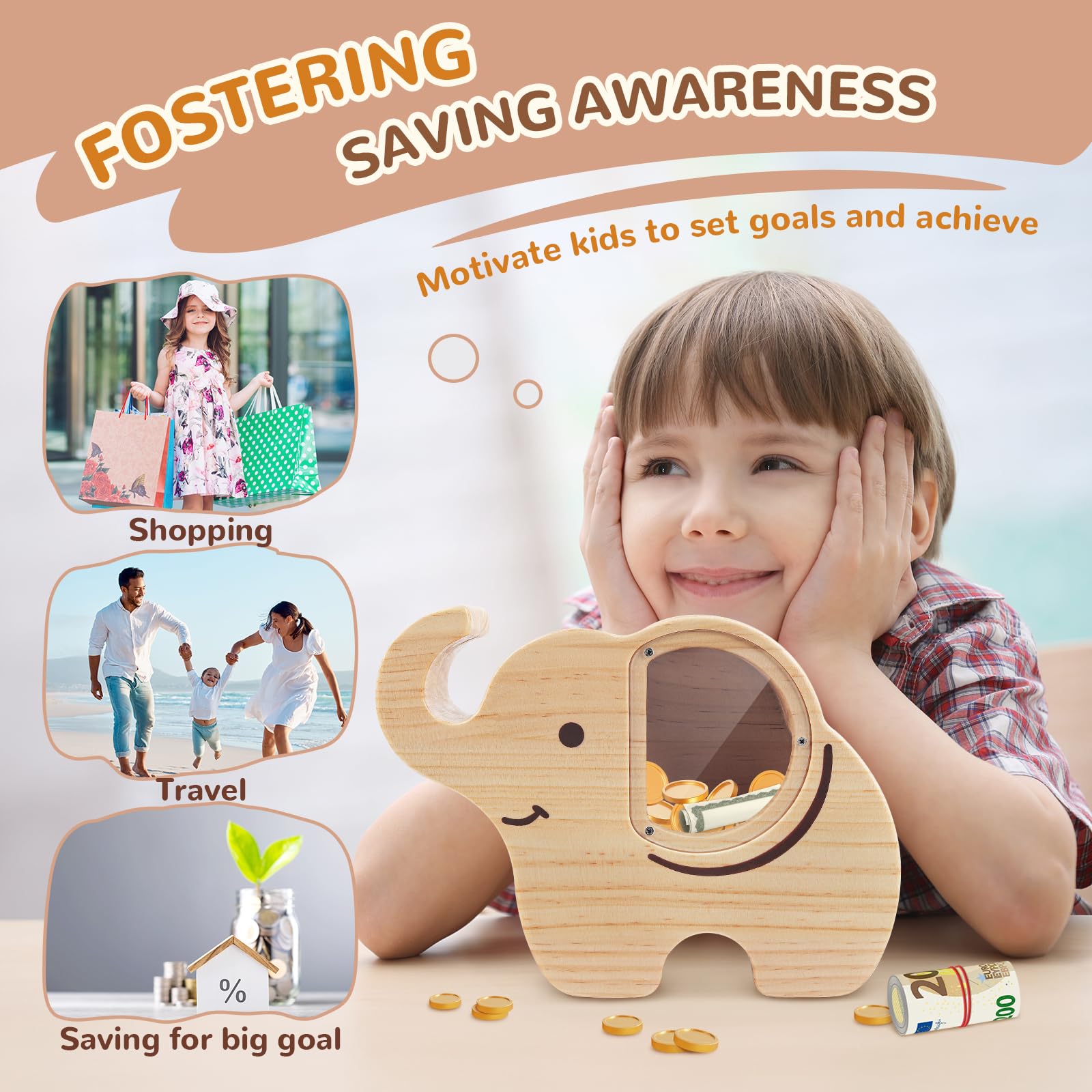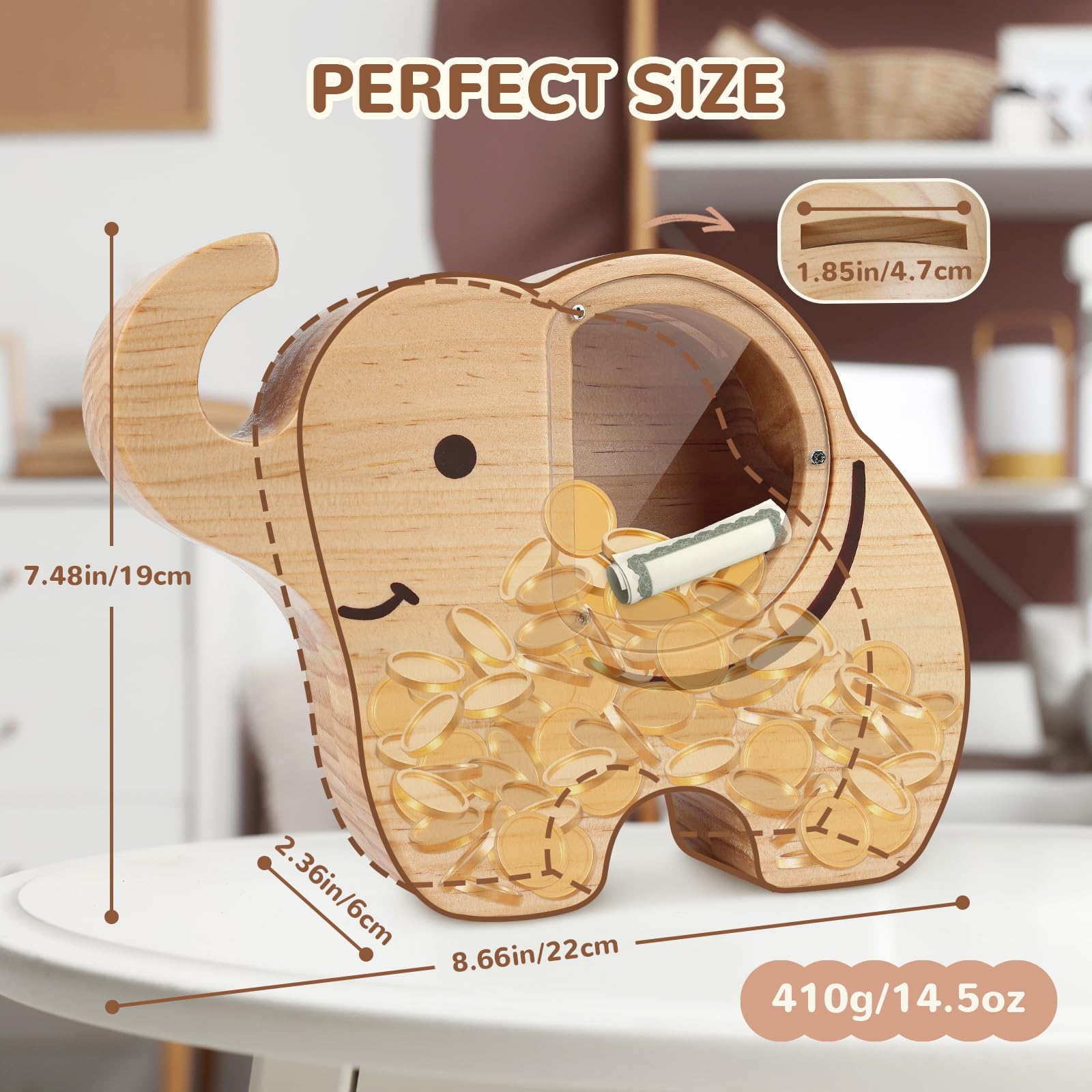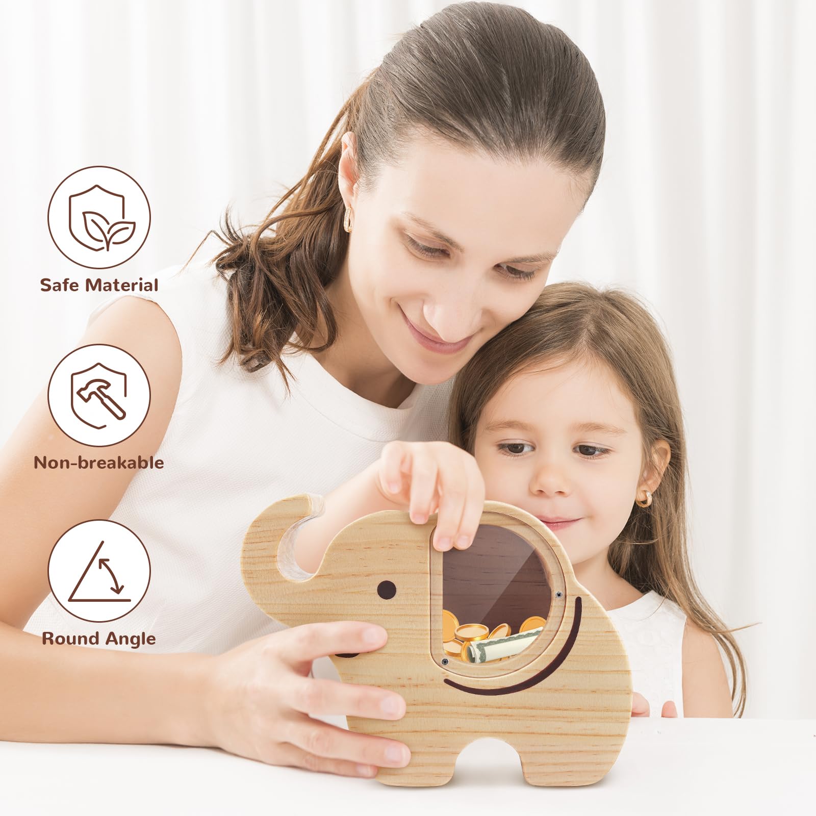 Wooshwa Elephant Piggy Bank For Kids, Wooden Money Bank For Boys Girls Toddler, Unbreakable Bills And Coins Cash Box, Creative S