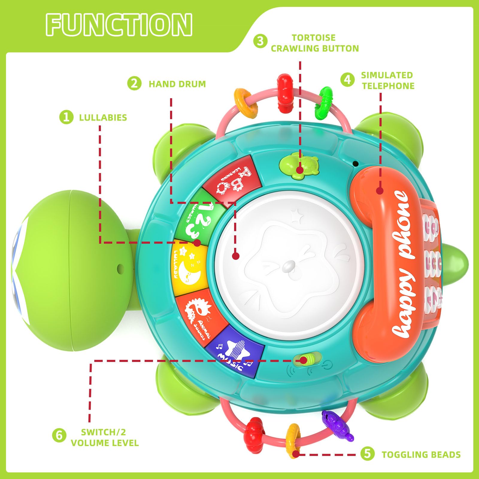 - Q: How does the turtle toy support early learning for babies? A: This multi-functional turtle toy aids early learning by helping babies learn numbers, letters, colors, and shapes through engaging music, lights, and interactive buttons, promoting motor skills and visual development.