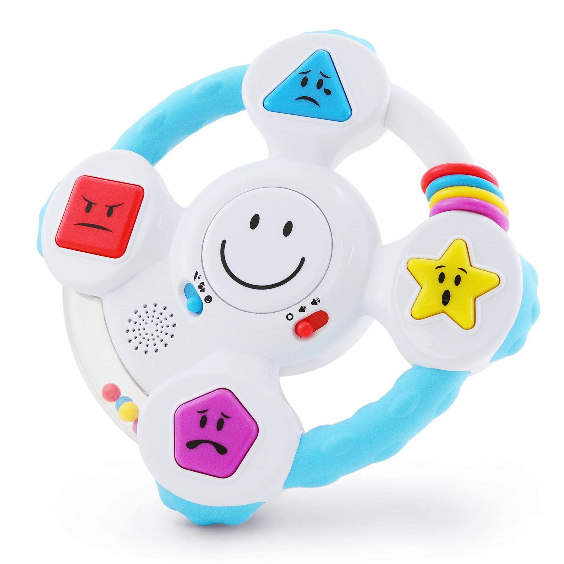 An interactive and educational light-up toy to stimulate your little one's hand and eye co-ordination with fun and simple way to learn about the colors, shapes, feelings, and play lovely songs and music! Educational Interactive Spin Steering Wheel for Infants, Babies, Toddlers and Kids - Perfect Development Musical Activity Center Toy Present for Babies, Infants, Toddlers, Boys or Girls Aged 6 months to 3 years old. 3 Modes with loads of learning activities to play. Explore their curiosity with light-up color buttons, music, songs and SPIN! The ideal Birthday gifts or Christmas presents to have a blast while learning. This fabulous educational toy is loaded with interactive features that keep little ones happily engaged and entertained as they learn and play. Its colorful design is rich in visual and tactile detail - colors, shapes, rings, beads and buttons that stimulate nonstop curiosity and investigation. The steering wheel's auditory and visually interactive features are triggered either by spinning the wheel on its slip-proof base or by pressing any of its 5 interactive light-up buttons, each of which has a distinct color, shape, and a face that conveys a different emotion. Pressing any of the buttons produces varying responses depending on the mode selected and the number of times it is pressed - words, phrases, sentences and songs through which little ones learn about colors, shapes and feelings. In Shapes and Feelings mode in particular, each button responds like a living character, making it easy for youngsters to relate and thus to learn. My Spin & Learn Steering Wheel is ideal for early learners and teaches colors, shapes and emotions while promoting hand-eye coordination and language development. Our standards of quality and safety mean that all products have been tested and evaluated to conforms to global toy safety standards (such as Europe Safety Standards of EN71, CE, RoHS, Cadmium and Phthalates or USA's ASTM F963, CPSIA, etc...).
