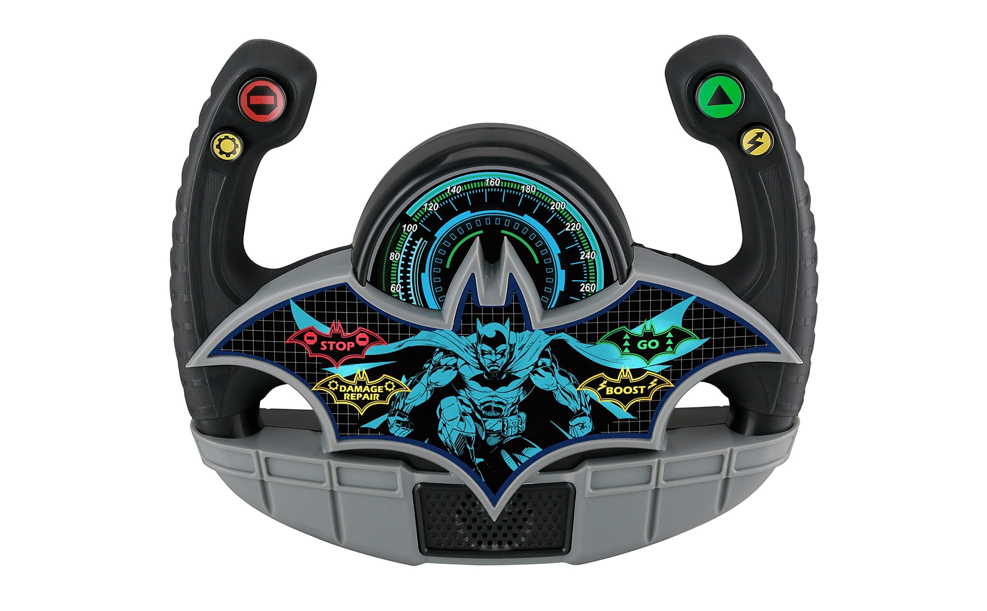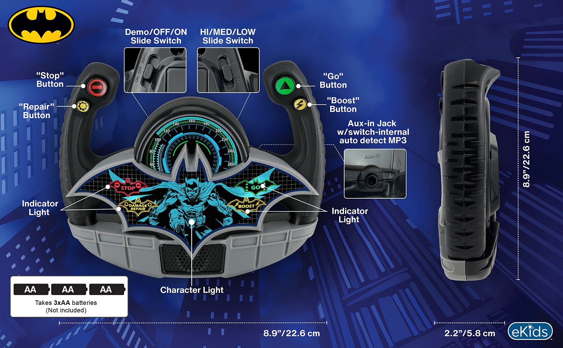 Join Batman for the ultimate interactive challenge! The Batmobile Adventure Wheel has everything you need for an action-packed crime-fighting experience. Feel the steering wheel rumble and react to your movements throughout your ride while speech and sound effects guide your adventures. The light-up display mimics a real dashboard, too! Kid-friendly controls makes it easy and fun to play along, plus, you can connect your MP3 player to the built-in aux jack to play your own music, too! With bold graphics inspired by the iconic Batmobile, this toy is the perfect gift for any fan of the popular superhero. Visit the ekids brand store to explore even more cool toys for kids!