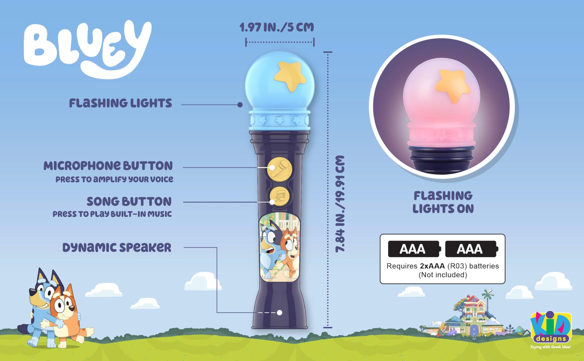 The Bluey Karaoke Microphone makes great stocking stuffers for toddlers! Press the Song Button to play an extended clip of the Bluey Theme Song from the popular series. Press and hold the Microphone Button to amplify your voice while you sing along! Kid-friendly controls make it easy to perform, while an LED light show pulses along to the music. Lightweight, durable, and portable, this kids microphone goes anywhere you want to sing your heart out. If you are shopping for toddler toys, this Bluey Microphone is specially designed for kids aged 3 and up. Visit the ekids brand store to explore even more cool kids toys!
