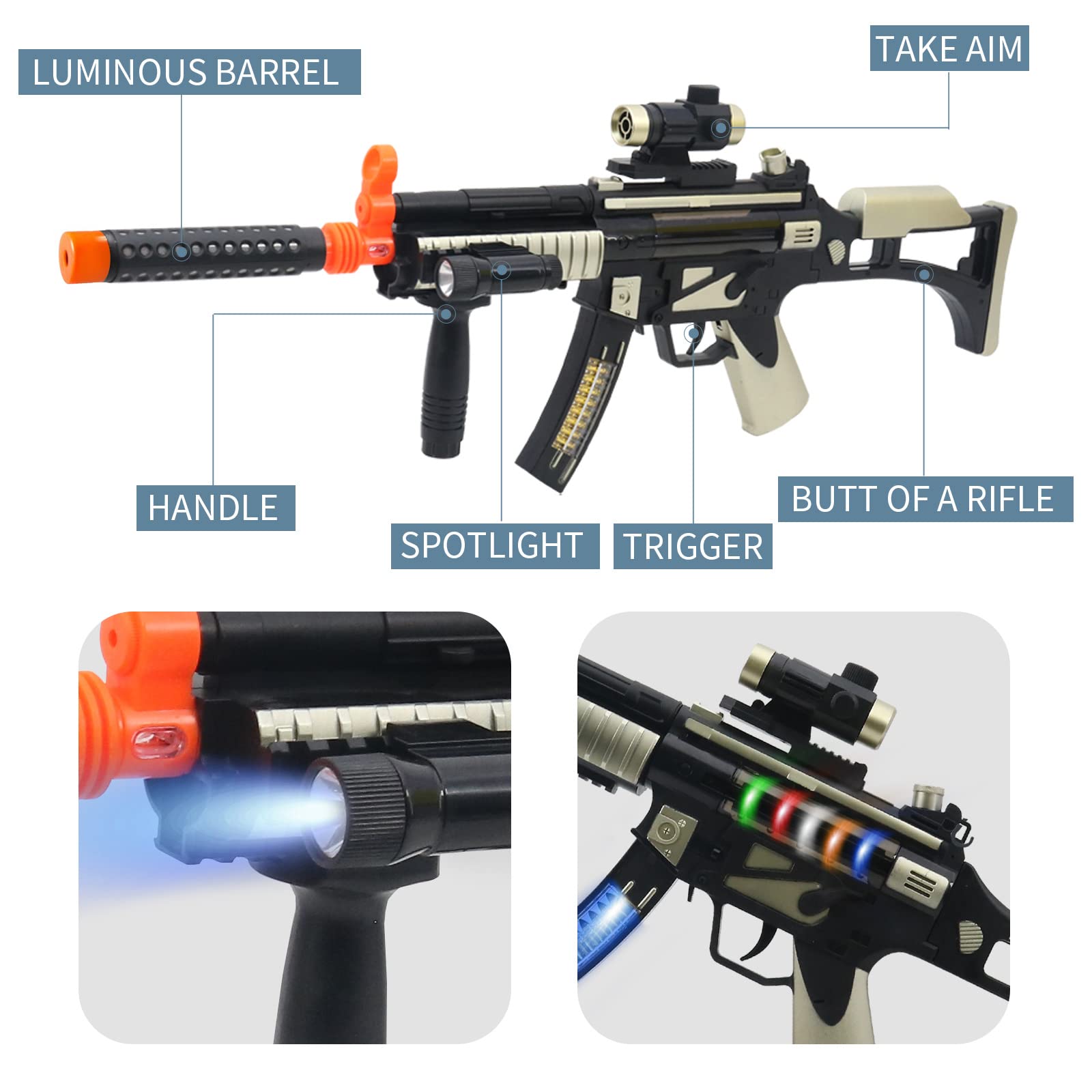 • Q: What features does the INCHOI Light Up MP5 provide for play? A: This toy features exciting electronic sounds, flashing lights, and vibrations when the trigger is held down, stimulating imaginative play for children.