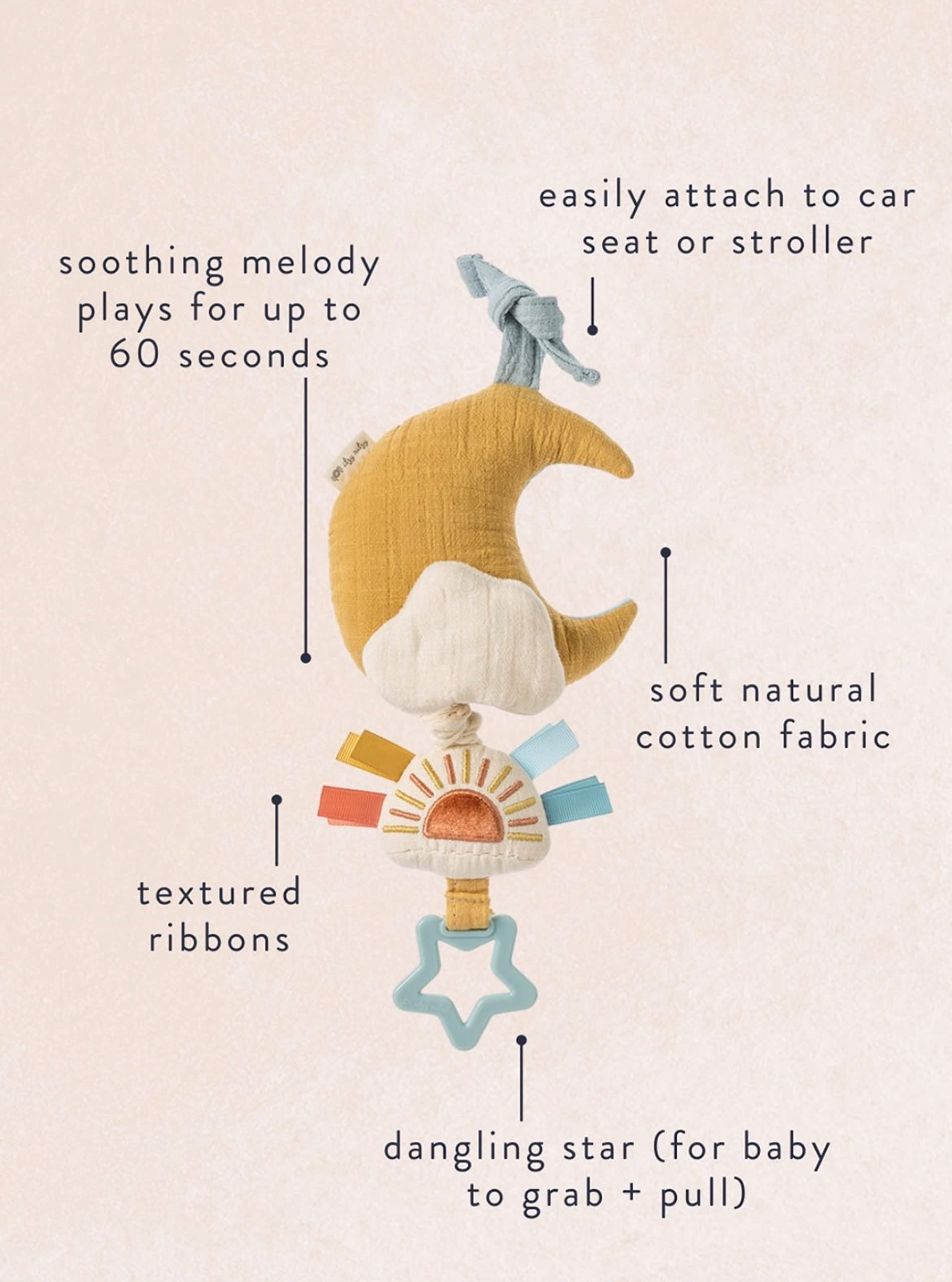 A lullaby to go! Create calming vibes wherever you go with our Bitzy Notes hanging baby toy for play gym, car seat, and stroller. Made from soft natural cotton, this enchanting companion easily attaches to your babys travel gear, playing a gentle melody when pulled. Its textured ribbons and grasping ring not only entertain but also encourage further interaction from your little one one like reaching and grasping. Perfectly sized and designed with practicality in mind, the Bitzy Notes toy is an ideal choice for soothing your little one during travels or daily outings. Cue the music, its time to chill!