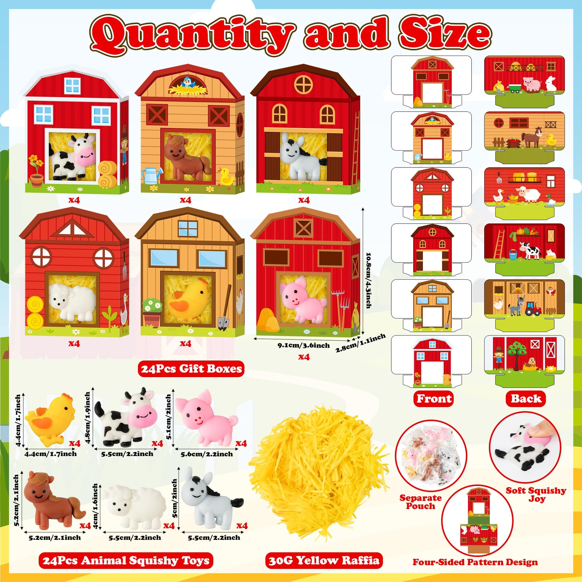 Whats including 24PCS farm animal squishy toys 24PCS farm house gift box 1 Pack raffia filler for gift box As gift: You can use it as birthday gift or holiday gifts for your kids or grandchild As a toy:The farm animal gift pack not only can be party gifts for kids it also a funny toy for kids Attention The product is not eatable for the children under 3 years old please use under mature-themed supervision