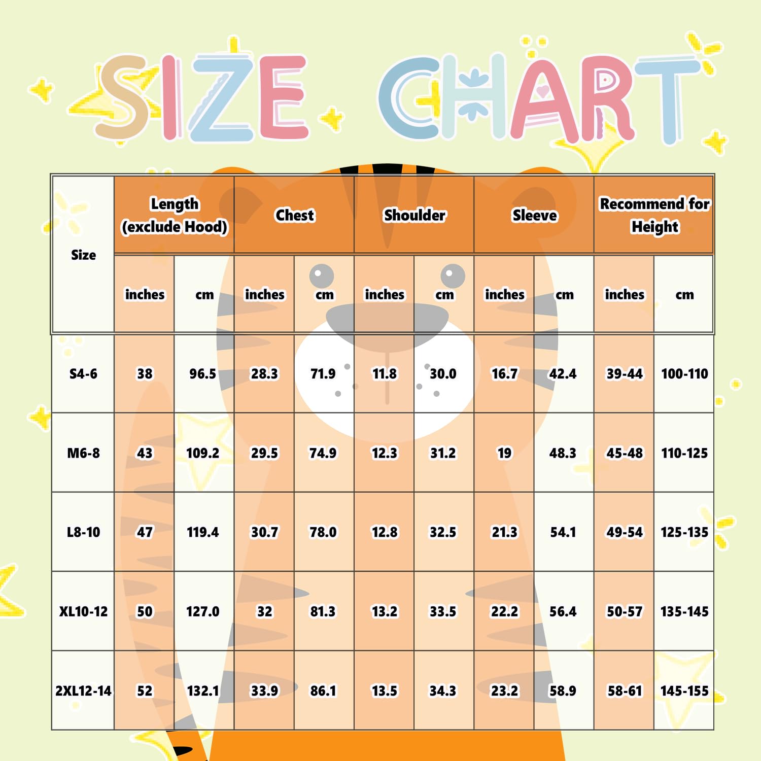 Tiger Onesie Costume for Kids-This is a very unique tiger costume for kids cosplay dress up,made of print fleece,warm and cozy. | Simple Construction&Cute Design-This tiger onesie is constructed with a hooded hat with emb tiger face,ears,zip up at the front.Easy to dress up and looks vivid. | Soft Lightweight Material-our tiger onesie for kids is made of middle thickness fleece fabric,machine washable. Super soft and warm for a chilly weather Halloween night. | Wide Size Range for a Better Fitting-there are 6 sizes of our onesie costumes,suggest to check against the size chart to select , the recommendations for height and weight would give you an easier choice . | Perfect for Halloween trick or treat,animal costume onesie parties,pjm parties,daily wear,dress up parties ,themed birthday parties,Xmas gift and more occasions.