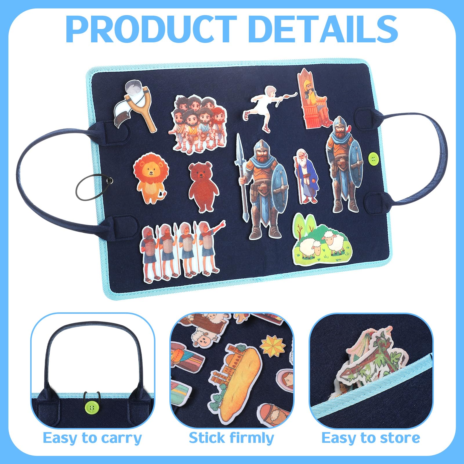 Features: This felt board bible stories set doesn't just offer hours of engaging playtime. It's a visual treat thanks to its multicolored components. Crafted carefully to keep the colors vibrant and engaging, our set is designed to fire your child's imagination while teaching them about famous biblical storylines. The bible felt board stories set provides a gentle but engaging introduction to these famous religious stories, promoting both learning and fun. The handbag style felt board makes it ideal for travel, making it a constant companion for your child, and ensuring they can find a source of enjoyment and education no matter where they are. Specifications: Material: felt Color: multicolored Size: Felt board: about 17.72 x 11.81 inches/ 45 x 30 cm Package includes: 1 x Felt board 4 x Felt board bible stories set (52 pieces) Notes: Manual measurement, please allow slight errors on size. The color may exist a slight difference due to different screen displays. People under 12 years old should be accompanied by adults.