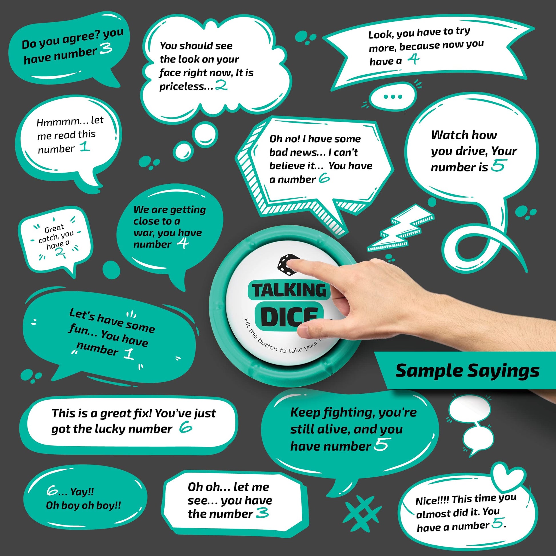 - Q: What are the phrases included in the Talking Dice Sound Button? A: The Talking Dice Sound Button features 102 totally random phrases for numbers 1-6, enhancing the excitement of your game nights.