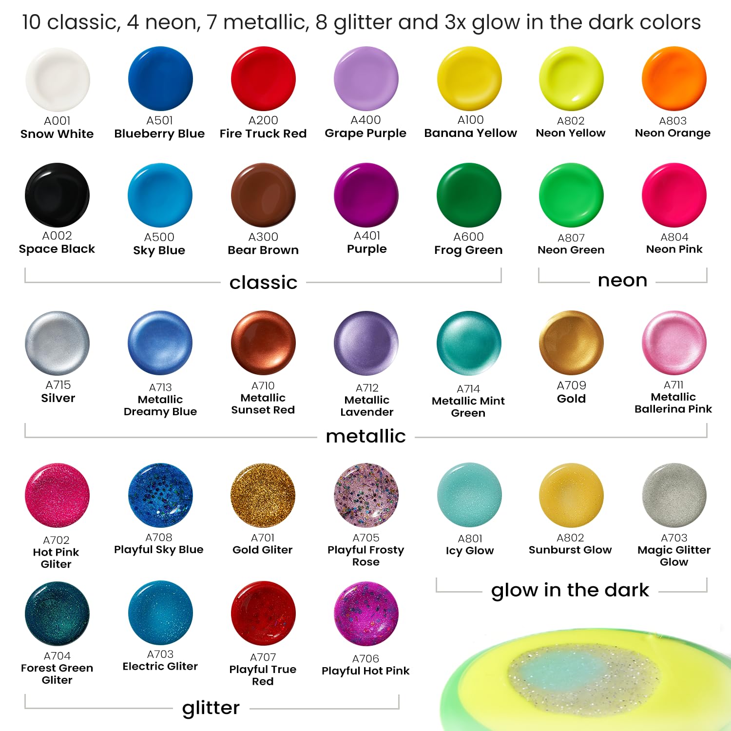 Enjoy a Variety of ColorsWith so many unique washable colors like glitter, neon, metallic, and glow-in-the-dark paint, you can play with different combinations and make original artwork that stands out. Children will love getting creative with this paint kit made especially for them and parents will love that the paints dont stain fabrics or skin.Multi-Surface UseThis set is ideal for poster painting, so you dont need to limit your creativity to one surface - with this tempera paint set, you can also make original designs on paper, glass, shells, rocks, and even cars. Decorate for the holidays, write encouraging messages for the school year, graduation, and football & soccer games.Not Just for KidsGrownups get to have fun too because the neon and metallic washable paint is great for party decorating and making craft projects. With 32 colors you can make signs for garage sales, meetings, anniversary parties, wedding send-offs, office gatherings, and more.