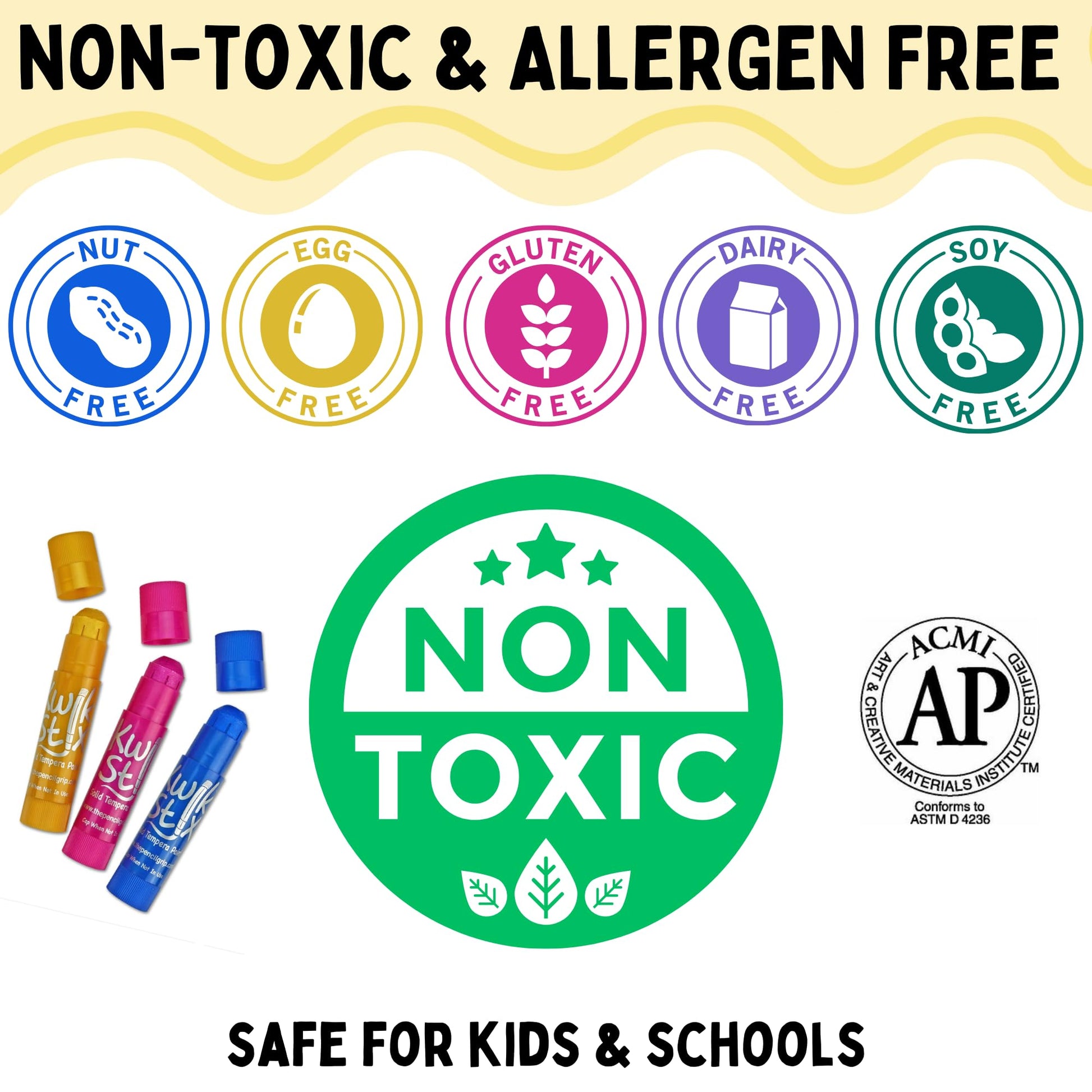 - Q: Are Kwik Stix paints safe for kids? A: Yes, Kwik Stix are safe for kids. They are tested by Duke Toxicology and carry the AP Seal, ensuring they are non-toxic and allergen-free.