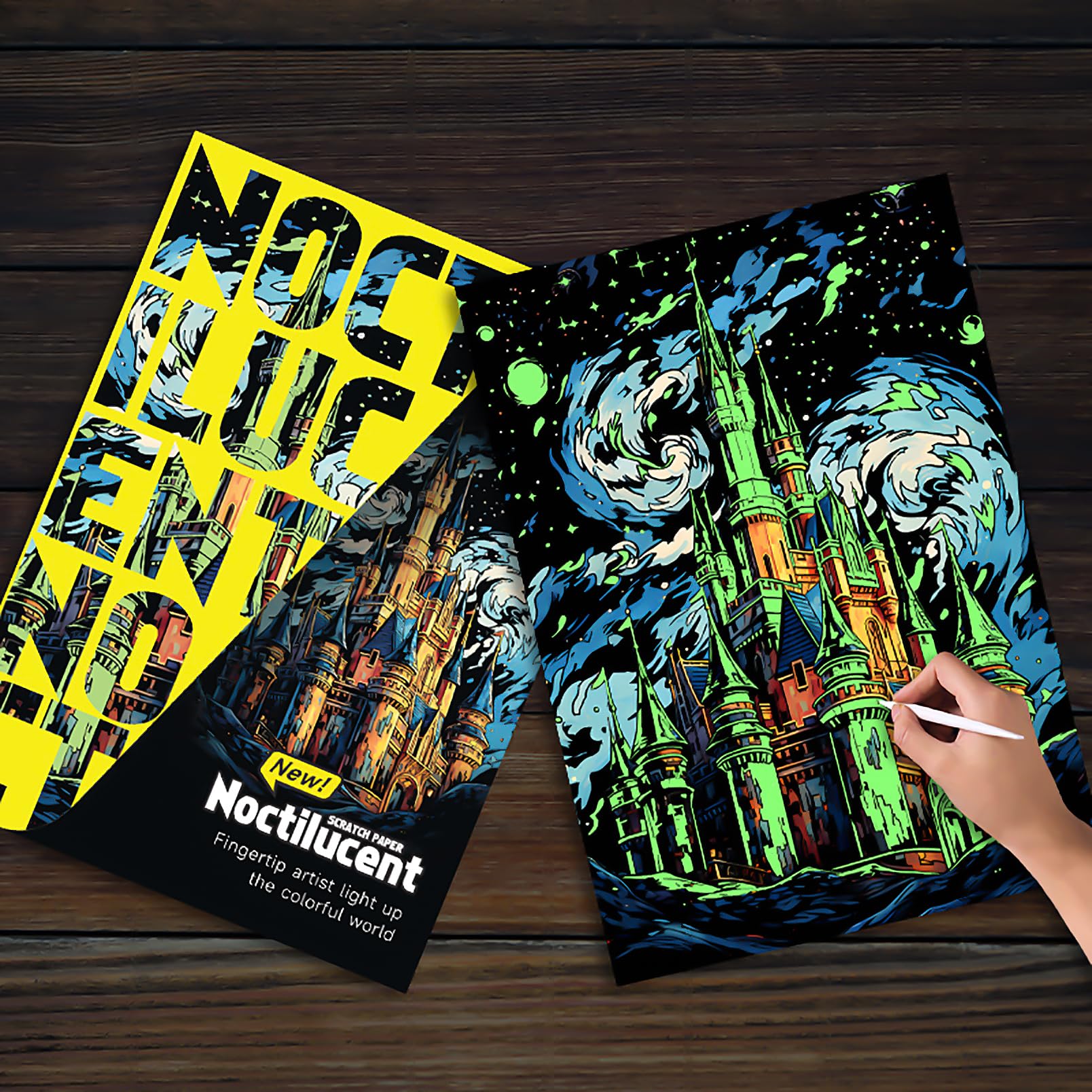2 Pack Night Glow Scratch Art Rainbow Painting Paper, Magic Glow-in-the-Dark Scraping, Van Gogh Style Creative Craft Set, Fun DI