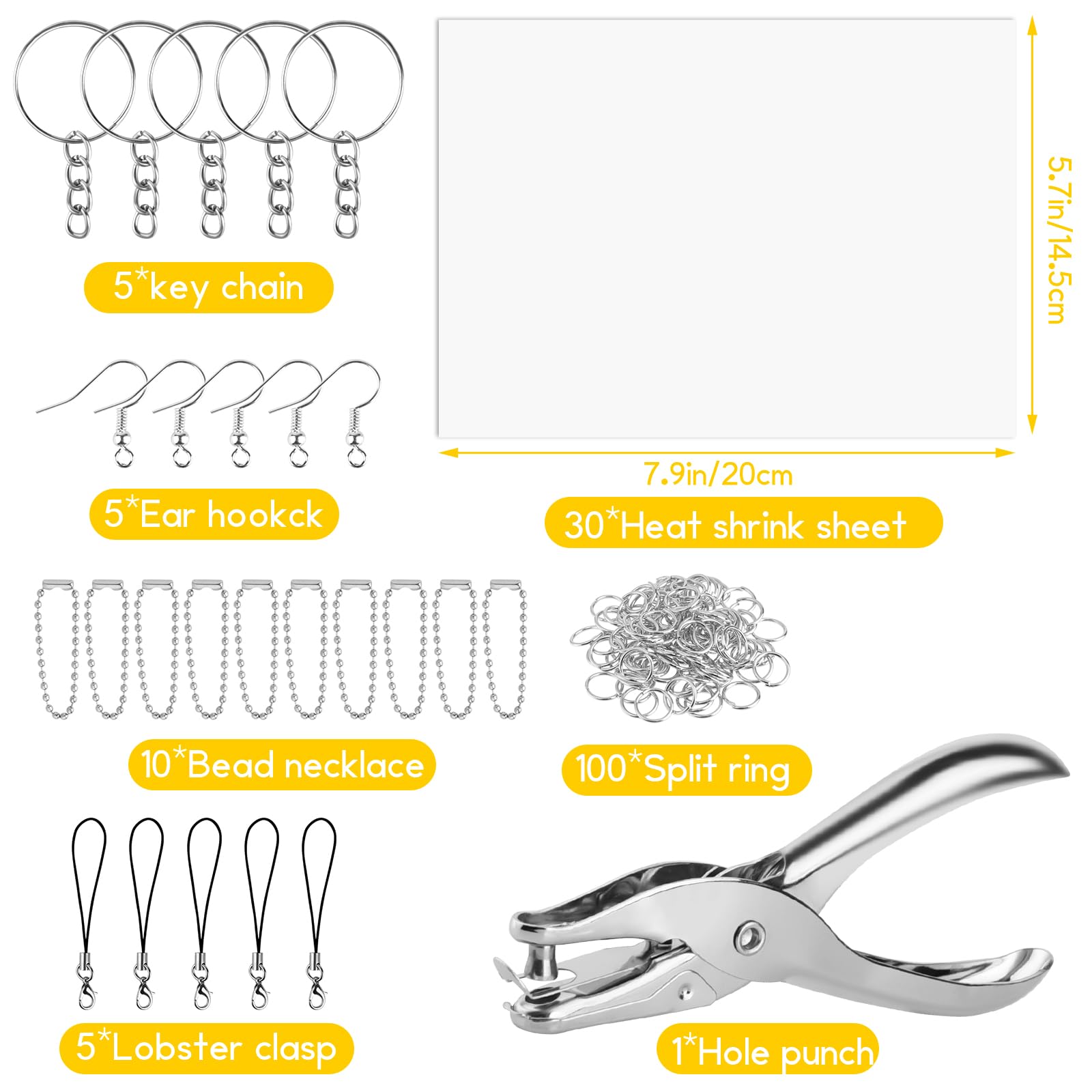 Brand: Bouiexye Material: PS Quantity: 20 heat shrink film sheets 5 keychain 5 lobster buckle 100 split rings 10 bead chain 1 x punch Note: Children should use them under the supervision of adults Beware of burns