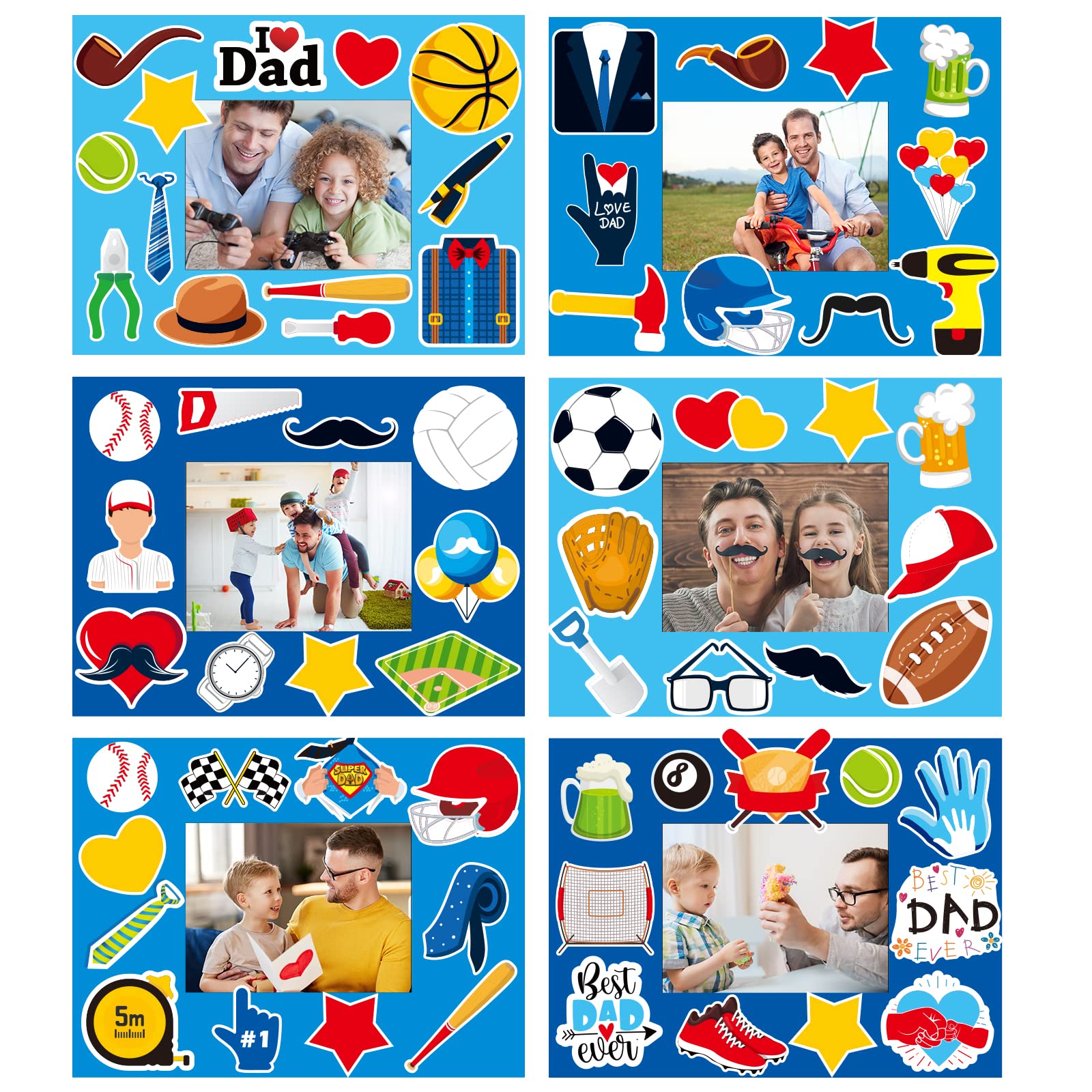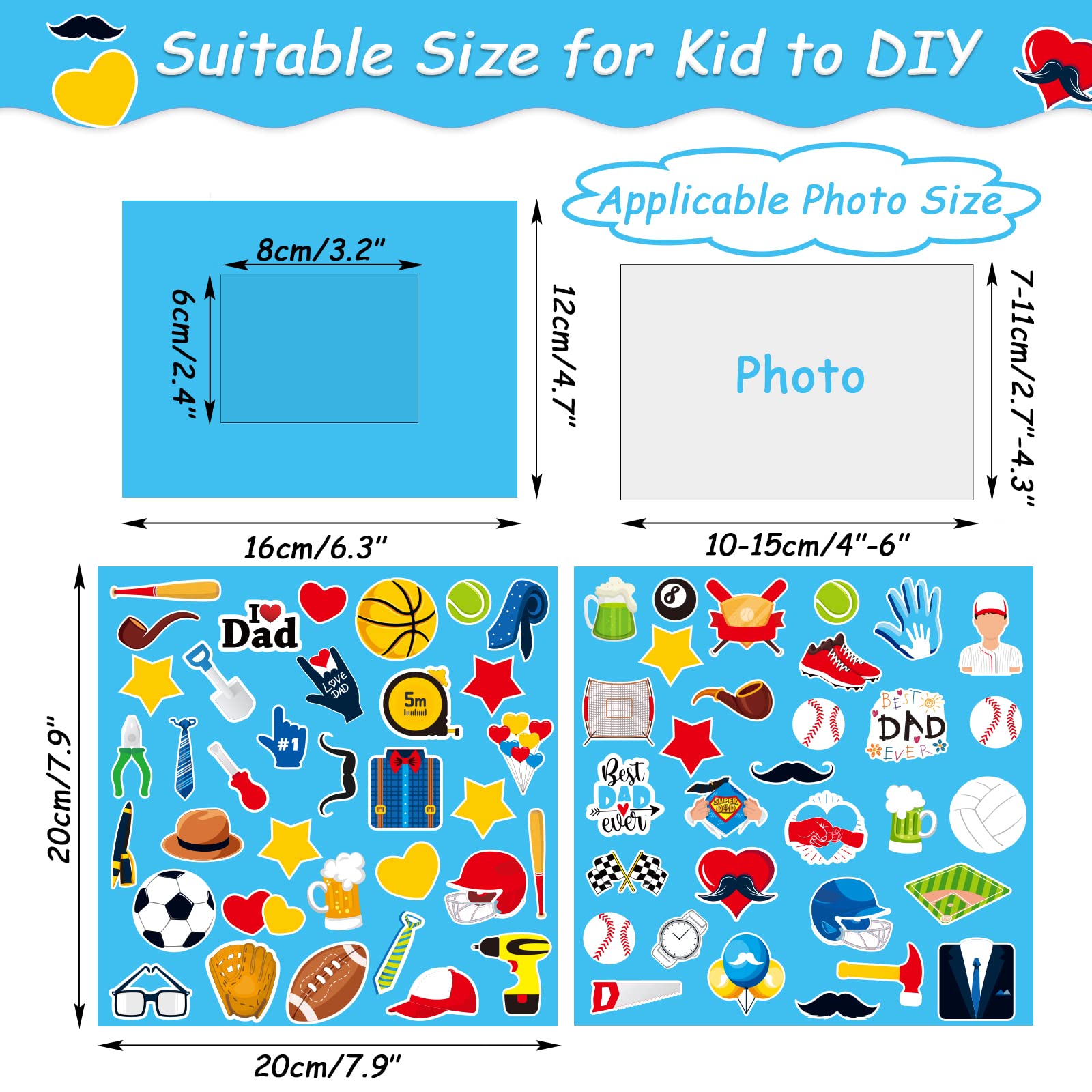 • Q: What are the dimensions of the picture frames and stickers? A: Each picture frame measures approximately 16 x 12cm (6.3 x 4.7 inches) with a picture space of 8 x 6cm (3 x 2.4 inches). The stickers range in size from 2cm to 4cm (0.8 to 1.6 inches).