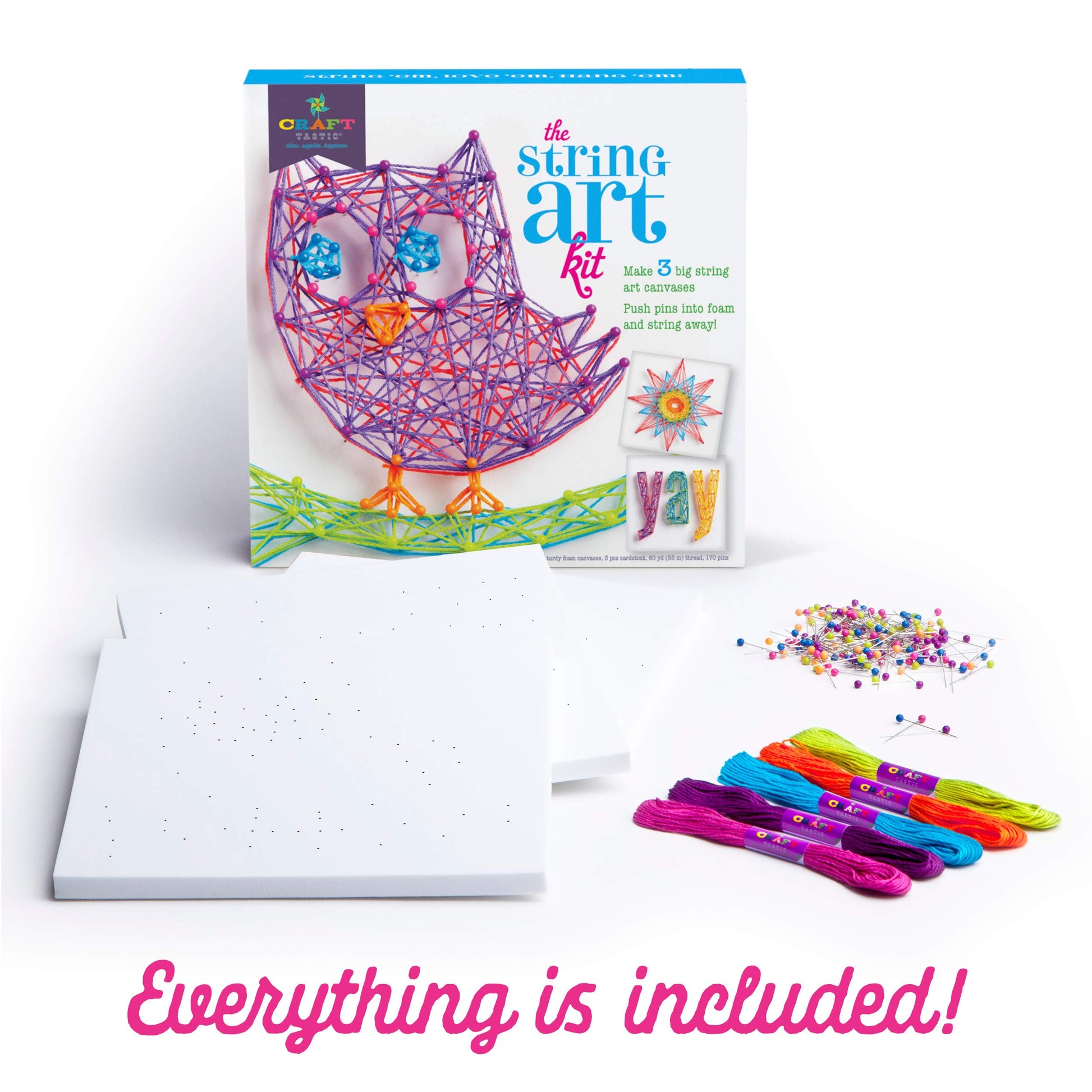 Designed for children age 10 years and above, this best-selling arts and crafts kit features three different 8.5 sturdy foam canvases pre-printed with an owl, a starburst, and the word YAY . This creative kit for teens and tweens also includes 60 yards of thread and 170 pins. There is no need for nails, hammers, or other supplies, which means there is no need to shop for craft supplies. More importantly, it allows kids to instantly begin honing their creative juices. Whether your kids prefer to use our pre-made templates or create designs of their own, the Craft-tastic String Art Kit is an affordable and easy to use craft kit for kids.Whether they are crafting pros or craft newbies, the Craft-tastic String Art kit is easy for kids 10+ to use. Kids simply push the pins into the sturdy, pre-patterned foam bases and string away. Once kids have finished their designs, they can hang them up and put them on display for friends, family, and others to enjoy. Arts and craft kits are one of the best gifts you can give children. When kids create, they develop critical problem-solving skills and learn to express themselves. The Craft-tastic String Art kit is a great arts and crafts gift that is a creative way to teach critical life skills.Why Craft-tastic? Craft-tastic represents all thats cool and trendy in the amazing world of crafts. Only the highest quality materials and components are used in Craft-tastic craft kits. Theyre specialty products, without specialty pricing. Ann Williams Group is a small, Michigan based, women owned company that makes the Craft-tastic and Craft Crush brands. Our CEO is both a maker and a Mom who is deeply passionate in her beliefs that hands-on making is a critical part of child development. By tapping into their curiosity for creativity, she firmly believes crafts help kids learn to liberate their inner creator, unleash their imagination and gently challenge the conventional by crafting.