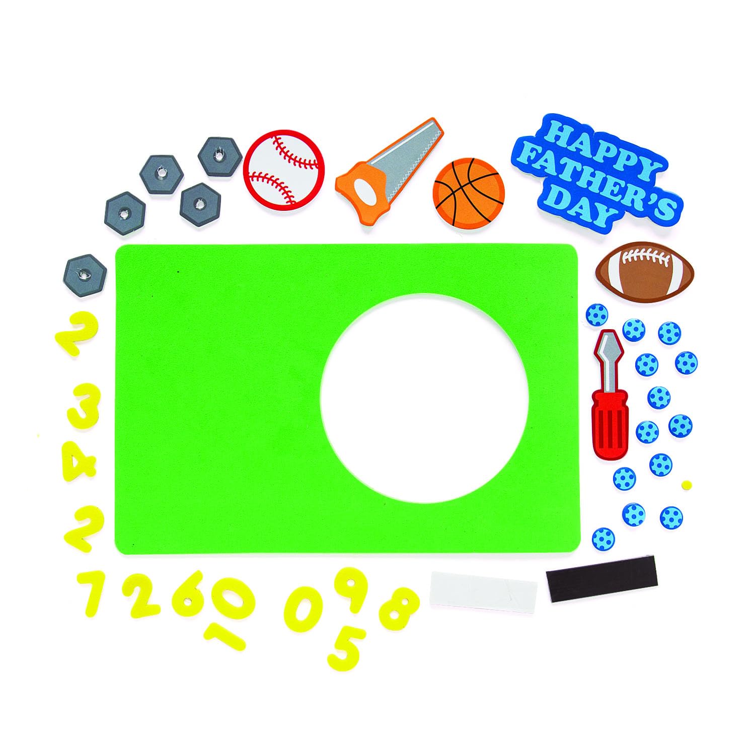 Thank Dad on his special day with a thoughtful Fathers Day gift. Our Fathers Day Picture Frame Magnet Craft Kit is a fun and easy craft kit for kids theyll be proud to present to a wonderful father figure. Put a special family photo inside to make each magnet one of a kind. Add this picture frame craft kit to your classroom supplies so your students can make a thoughtful present that fathers and grandfathers will treasure for years. Includes self-adhesive foam pieces and magnets. 7 1/2 x 5 with 3 1/2 diam. photo spaces. All craft kit pieces are pre-packaged for individual use. Kits include and extra pieces. Makes 12.