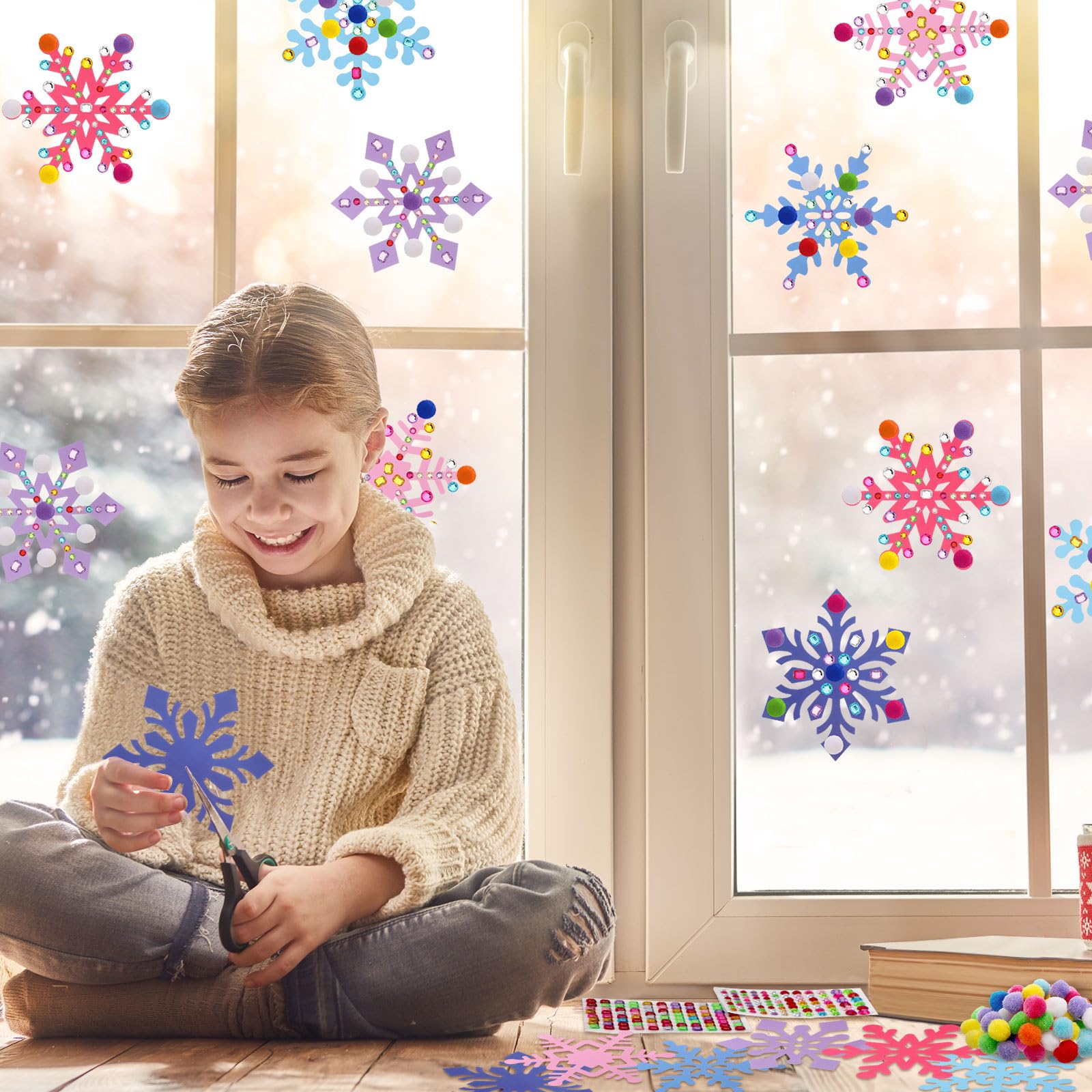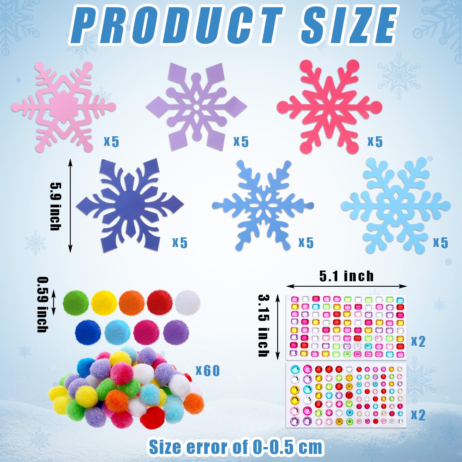 Features: This bulk winter craft kit can be given as a gift to your children, students, etc., so that they can enjoy the fun of DIY production. You can create and decorate items in your home by these winter crafts for kids with your children to enhance mutual feelings. Specifications: Material: 250g coated paper, acrylic, polypropyleneColor: as shown in the pictureSize: Snowflake craft: about 5.9 inches/ 15 cmPackage includes: 30 Sets of snowflake craft60 x Colorful pompoms4 Sheets of gem stickersNotes: Manual measurement, please allow slight errors on size. The color may exist a slight difference due to different screen displays. Small items, please keep the products away from kids to avoid choking risk.
