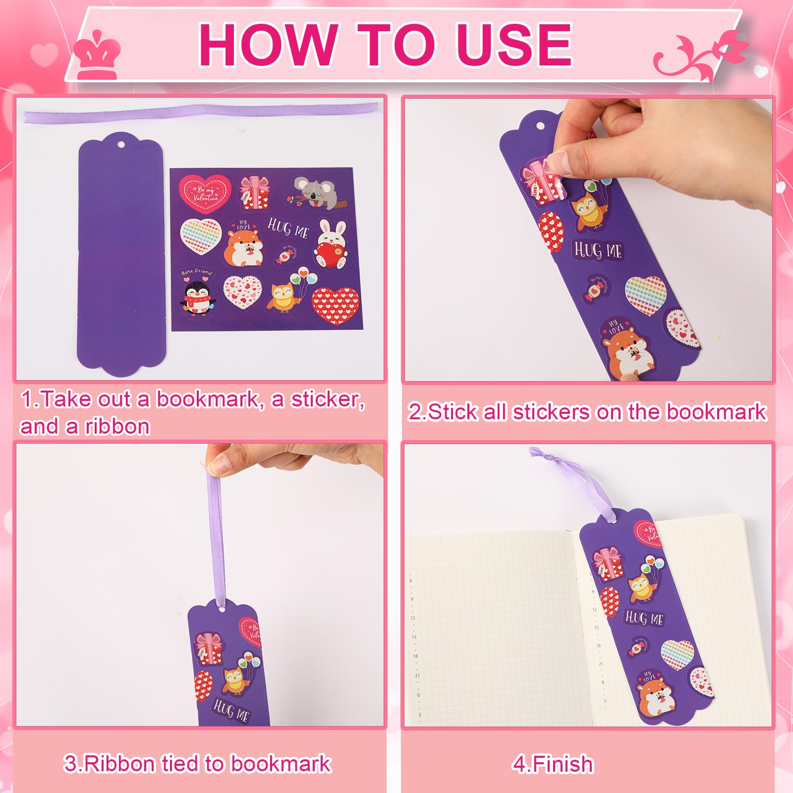 JUNEBRUSHS 30 Pack Valentines Crafts for Kids, Valentines Day Bookmarks Craft Kits with Assorted Hearts Animal Stickers for Kid