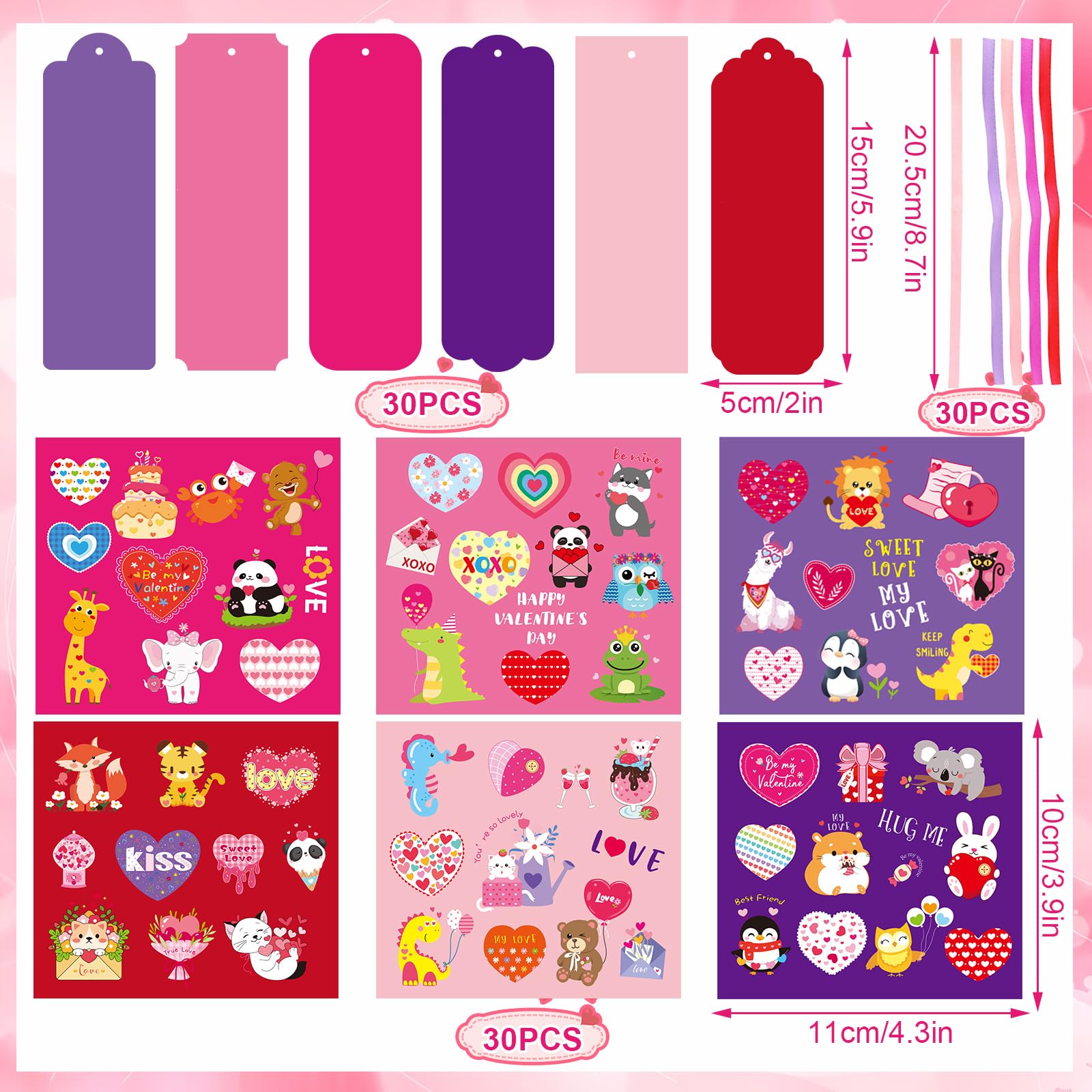 Description Type: Valentines Day Crafts Kits for Kids Color: colorful pattern design Material: Double-sided laminated cards and stickers Quantity: Contains 30 Valentine Bookmarks (6 different styles), 30 stickers, 30 strings Want your children to spend Valentines Day full of fun and creativity? Dont miss our unique Valentines Day craft kits for kids! Each set comes with 30 cute animal body cards in 6 different styles, allowing children to create their own unique Valentines Day cards. We carefully prepared 30 gorgeous stickers, Kids can create the valentine bookmarks of their dreams with just one click of sticker. This DIY process not only cultivates creativity and imagination, but also encourages hands-on ability and concentration. We specially select double-sided laminated cards and stickers to ensure durability and quality in making your own ornament kit. These materials are strong and durable, water proof and not easy to tear, and odorless. They are absolutely worry-free, allowing parents to feel at ease and let their children freely enjoy DIY fun. Each set also comes with 30 colorful strings (pink, red, purple), making it easy to hang the completed Christmas ornaments into eye-catching decorations. You can hang them in your home, classroom, or attend a Valentines Day party to add color to the holiday