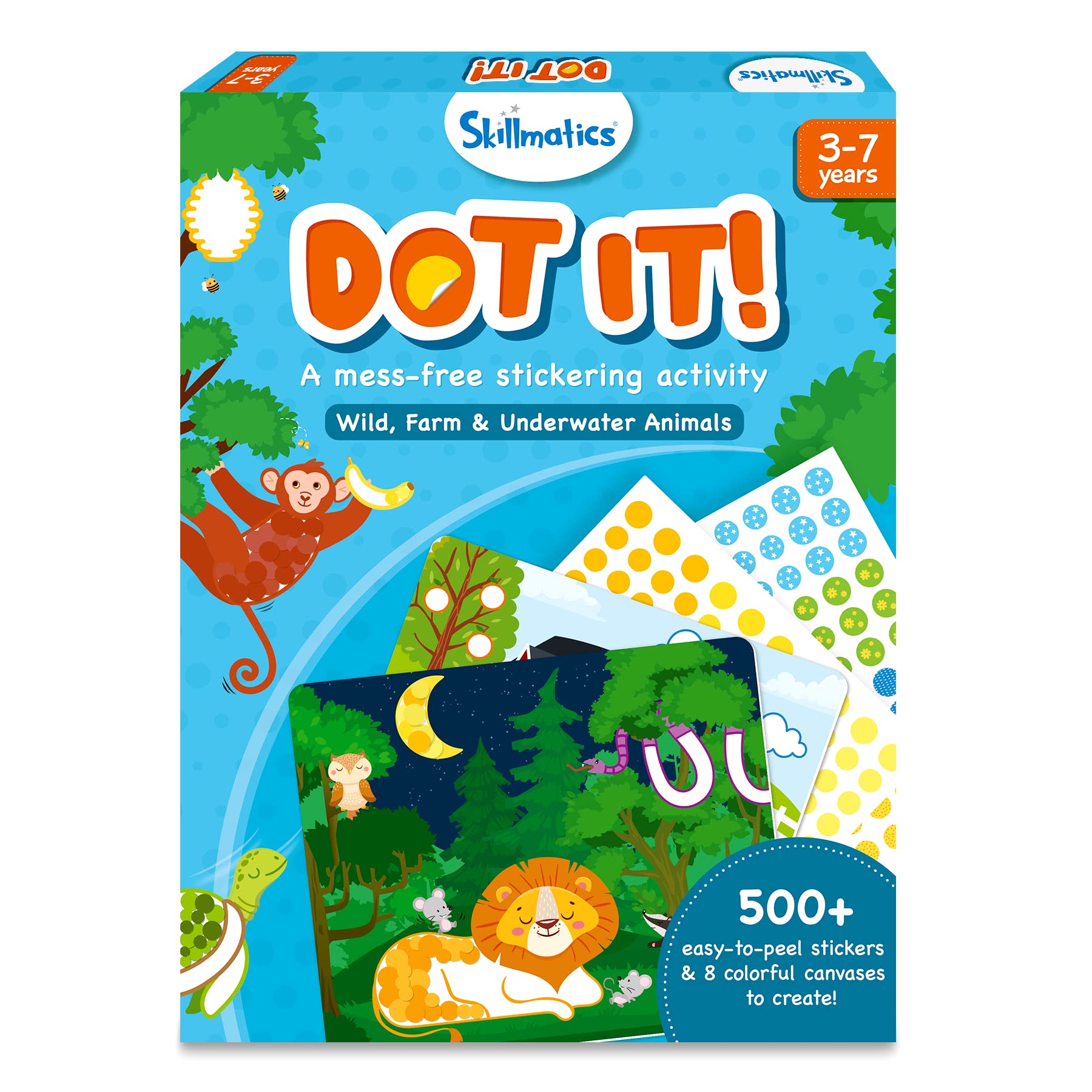 - Q: What themes are featured in the Skillmatics Art Activity Dot it? A: The themes include wild animals, farm animals, and underwater creatures, providing variety in art activities.