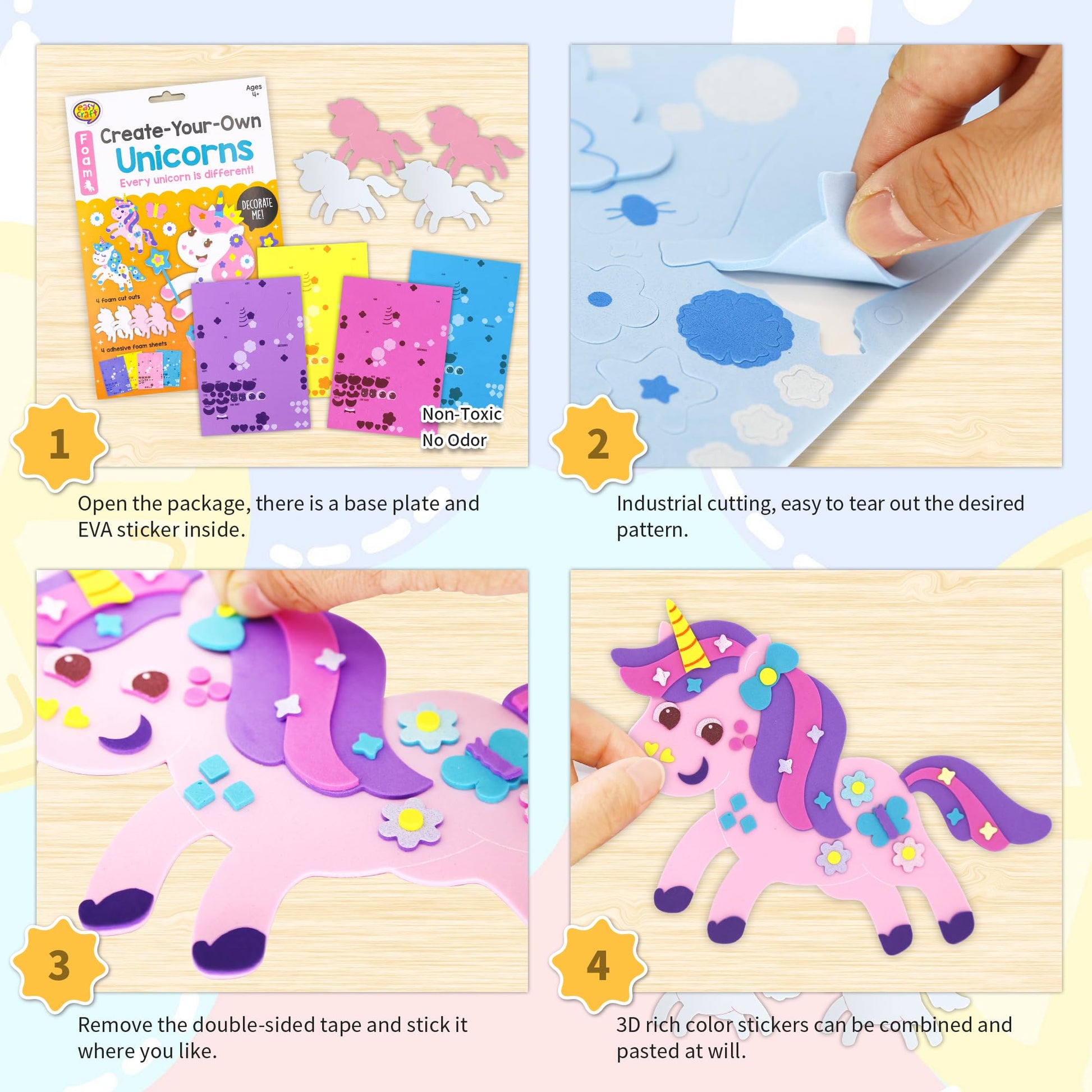 - Q: What types of projects can children create with this kit? A: Children can create their own 3D unicorns and other fun shapes using the 4 pieces of sticker cardboards with cut patterns and 4 unfinished unicorn forms provided in the kit.