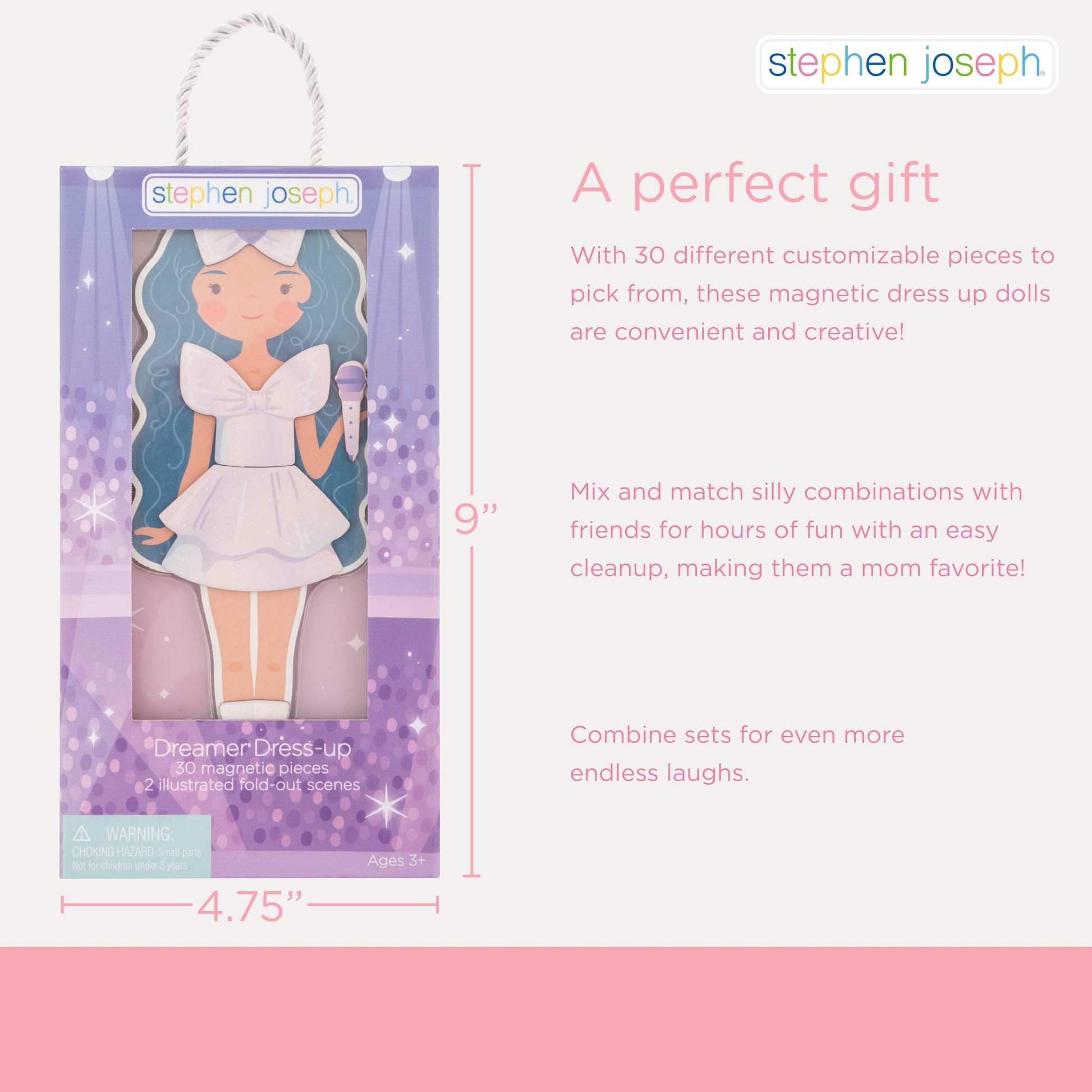 With 30 different customizable pieces to pick from, these magnetic dress up dolls are convenient and creative! Dress up your princess or mermaid in lots of different outfits and accessories to bring imaginative stories to life. Mix and match silly combinations with friends for hours of fun with an easy cleanup, making them a mom favorite! Combine sets for even more endless laughs. 1 magnetic wooden doll with stand 2 illustrated fold-out scenes 30 magnetic pieces to mix & match outfits! Approx. 4.75'' x 9'' x 2'' Spot clean