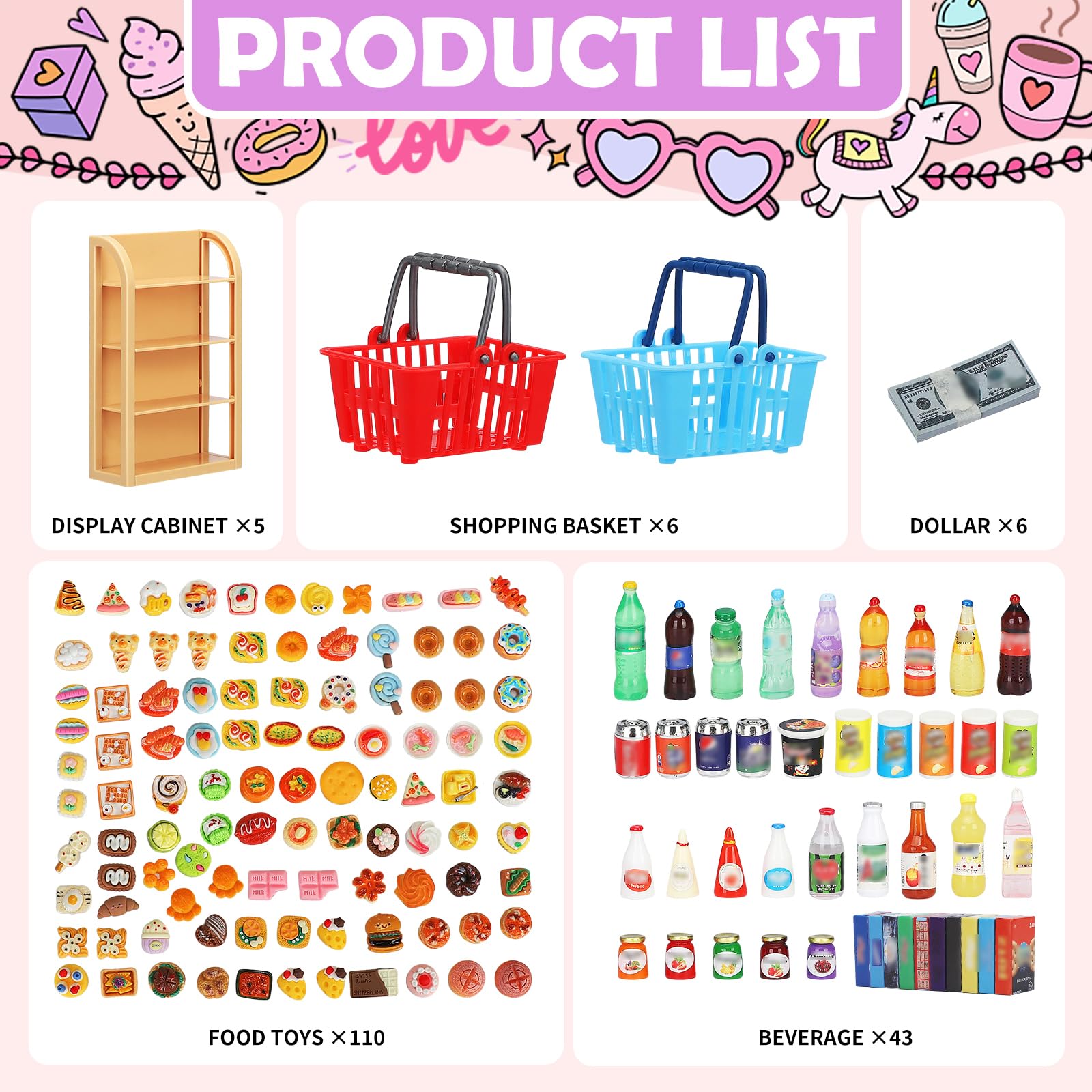 The doll house furniture for children is built with multiple storage spaces include multi layer shelves; Children can also store accessories in the shelves after playing with toys, developing the storage habit and cultivating the cognitive ability. Package Includes: 5 x Supermarket Shelves 110 x Miniature Food 43 x mini bottles and fruit 6 x Shopping Baskets 3 x Bundle of Paper Currency Model(each bundle has 15 sheets). Material : Plastic , Resin Color: As Pictures Show Note: small objects, not suitable for children under three years old, avoid swallowing. If you encounter any problems during the purchasing process, you can contact us at any time and we will definitely provide you with a satisfactory answer!