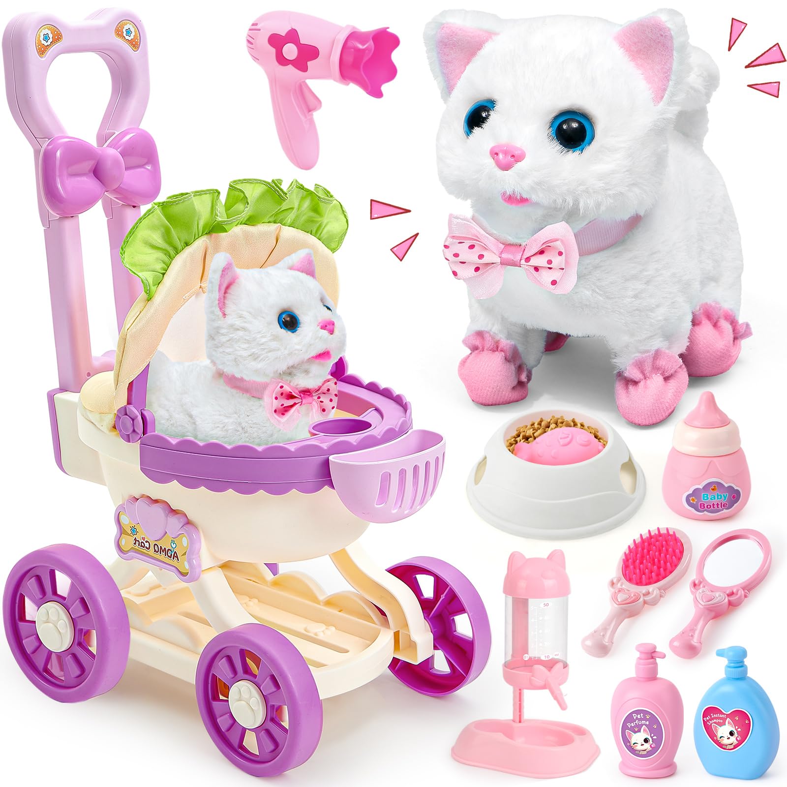 ?Cute Cat Toys for Kids?---This pretend play toy set comes with abundant accessories, including an electric stuffed cat(batteries not included), a pet stroller, a hairdryer, a comb, a mirror, a water dispenser, a pet perfume, a shampoo, a bottle, a bowl with fish. Your child can engage in imaginative role play and nurturing care, experience a wonderful childhood | ?Electronic Interactive Cat Can Walk, Meow and Wag Tail?---Put in the batteries and turn it on, the cute stuffed cat will walk, meow, and wiggle its tail like a real cat. Kids can learn to take care of their kitten, experience a variety of pet activities, such as feeding, bathing, combing and walking to create hours of fun play time. Parents can play with children to enhance parent-child relationship | ?Portable Pet Stroller?---This pet stroller with foldable sun canopy has a cute design that is sure to win the hearts of little girls. The wheels can roll forward smoothly, making this stroller easy to maneuver. The bottom storage shelf has enough space for toys accessories. Your kid can push the toy cat around the house or outside for a walk, and I believe she will definitely be the focus of the crowd. NOTE: The stroller requires assembly and adult assistance is recommended | ?Develop Imagination & Safe for Kids?---This toy cat plush is made of safe and high quality materials, and the stroller is sturdy enough, smooth toys surface design will provide maximum security for kids, children will get a lot of enjoyment in the interaction with the cute cat and accessories toys. These educational toys for 3+ year old will nurture children's empathy, improve their imagination and patience, encourage them to care for and love animals through play | ?Perfect Gifts for Liittle Girls?---For children who love cat, this will be a wonderful gift for early education, birthday, Christmas, Children's Day, holiday or just as a new gift. It must be surprise toys for girls, and you can tell your children about the use of these tools to improve the parent-child relationship. If there are any problems with the product after arrival, please let we know and we will reply and solve your problems in time