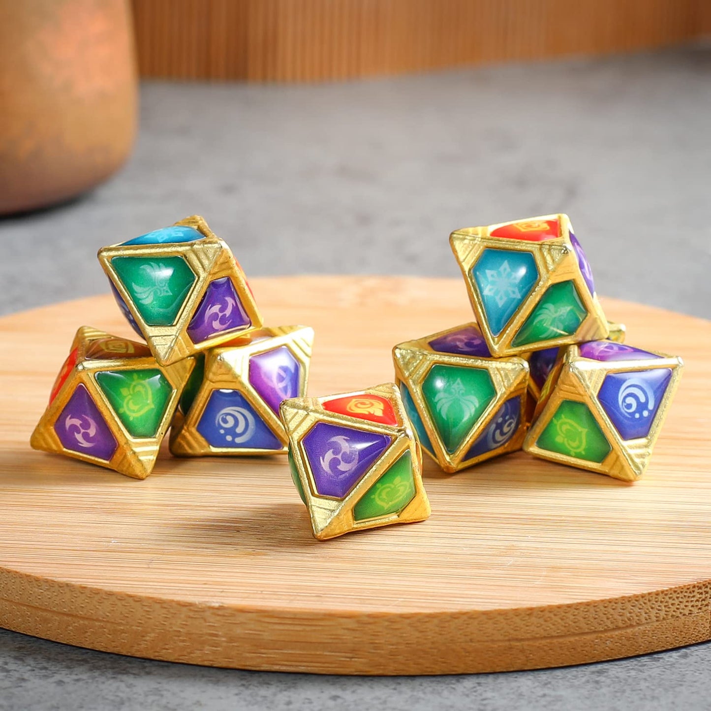 ?Genius Invokation TCG Dice Set?- Dice with 7 elemental & 1 omni element for Genshin Impact card game. Realistic restoration of in-game props