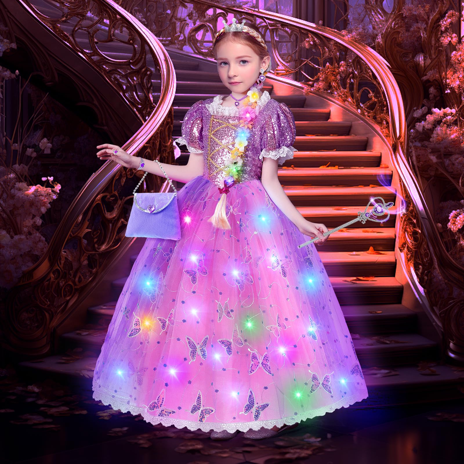 Our toddler princess dress up set was created to realize this beautiful imagination. Princess costume for girls comes with a led princessdress, bag, Princess wig with flowers and crown(comes with a led light string), princess crown, princess wand, necklace, earrings, princess ring, and bracelet, 2 strips string lights for dress.