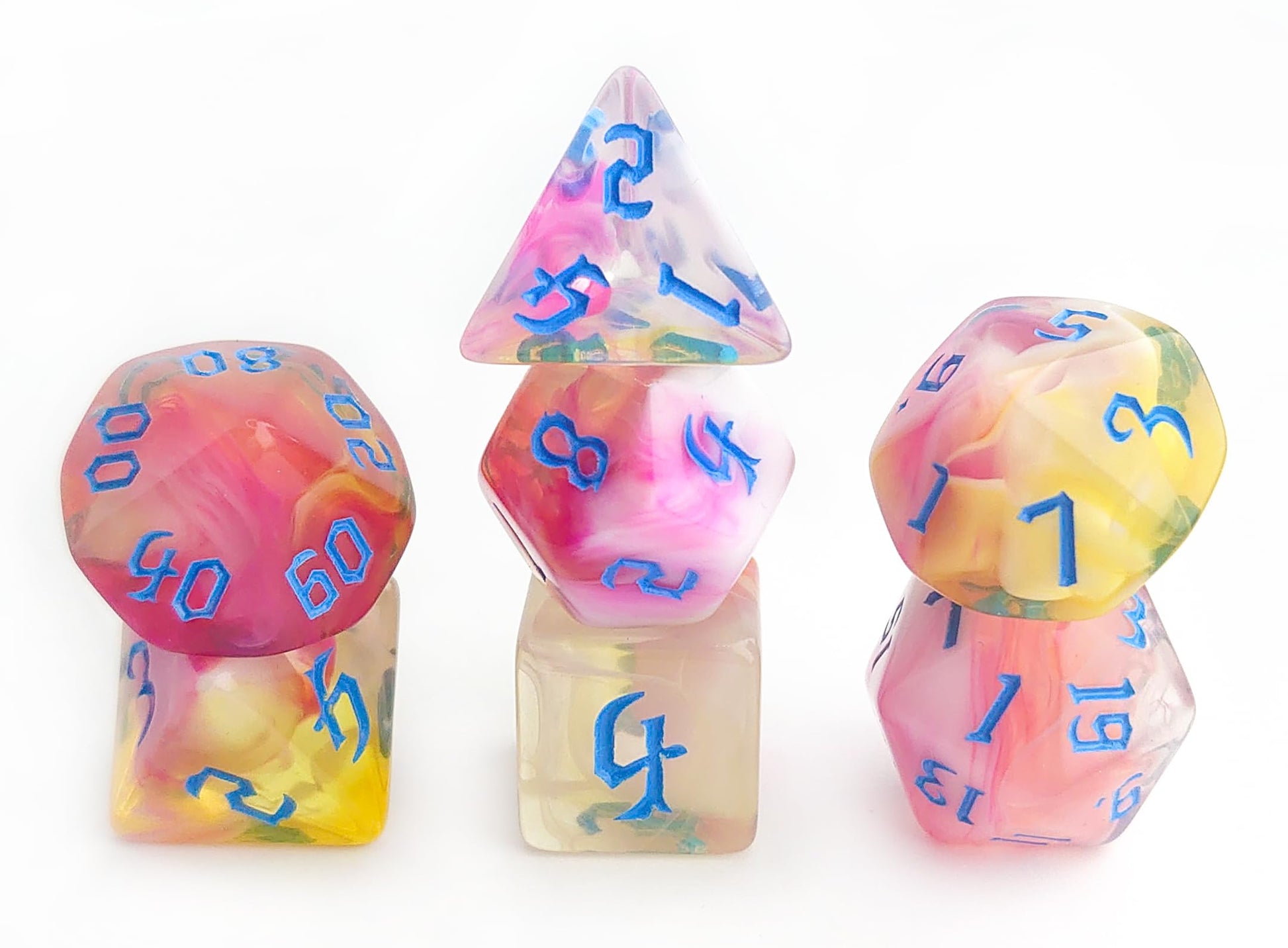 Standard 7-dice set for RPGs Role-Playing Games. Suitable for D20 system RPGs ( DnD, CoC , Pathfinder & Starfinder) and not only. Using them to inspire your imagination and have fun. They also can be a great gift for any RPGames' obsessed friend.