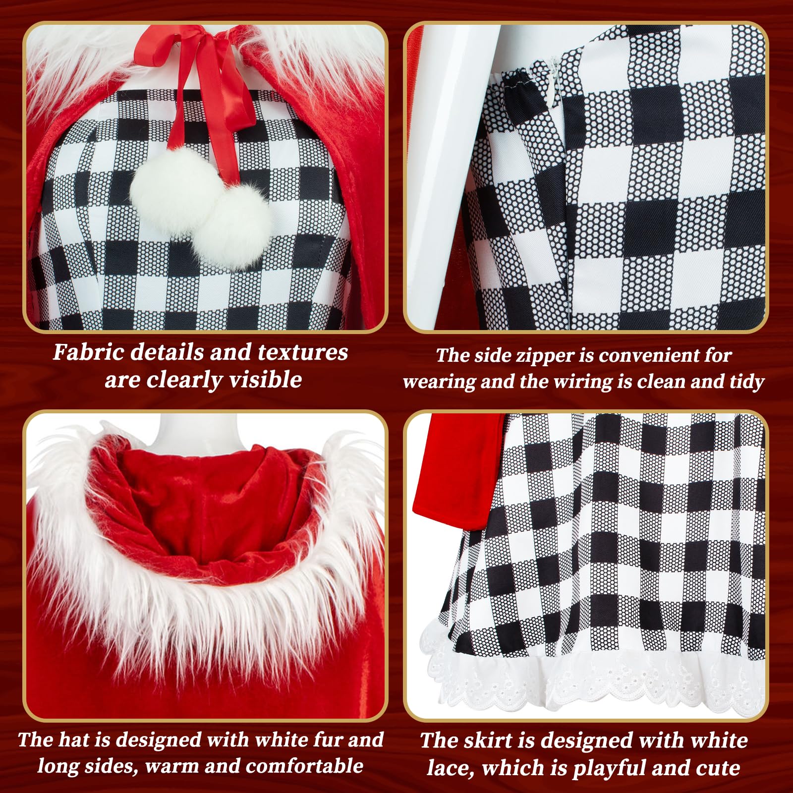 ?7PCS?Christmas Cindy costume includes: plaid dress, cape, pantyhose, gloves, wig, necklace, bow. Cindy dress with a variety of clothing accessories can make you the focus of the event. | ?Design?Christmas monster costume cindy lou who costume, the faux fur trimmed velvet red cape and the lace tulle layer underneath the plaid dress add a touch of whimsy. | ?Features?The design of the Kids Cindy Lou Who costume is based on classic Christmas characters, and the costumes are truly restored, allowing you to experience the character world. | ?Size?The girls Christmas monster costume comes in a variety of sizes, suitable for children aged 4-13. Please check the size chart carefully before purchasing to choose the right size. | ?Occasion?Christmas girl Cindy Lou Who costume is suitable for daily wear, and also suitable for Christmas, Halloween, carnival, school stage performances, theme parties, photo costumes, etc.