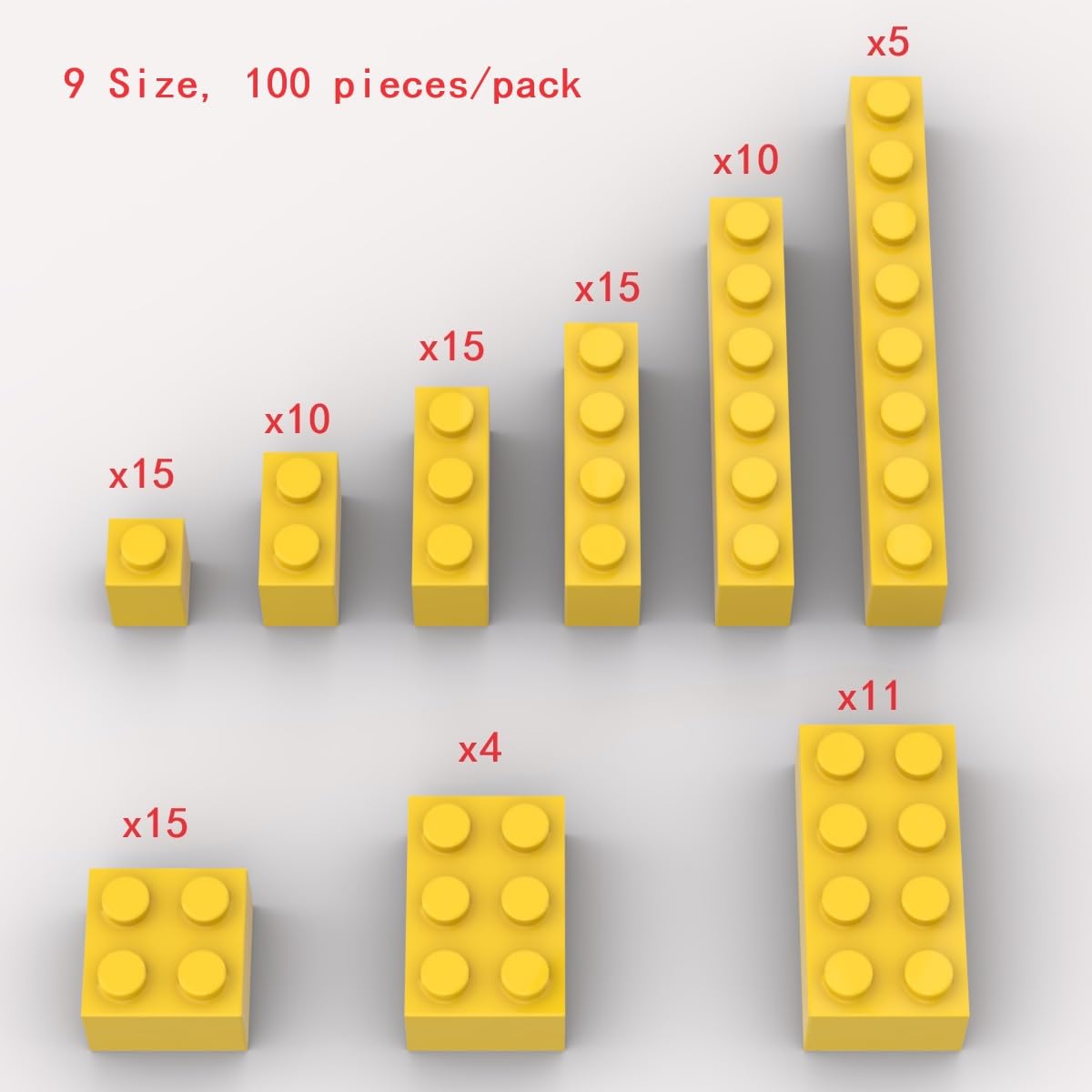 YUJHITP 100 Piece Yellow Bricks Bulk Assortment Pack, 9 Size Yellow Classic Building Blocks Bricks, Compatible with Lego Parts a
