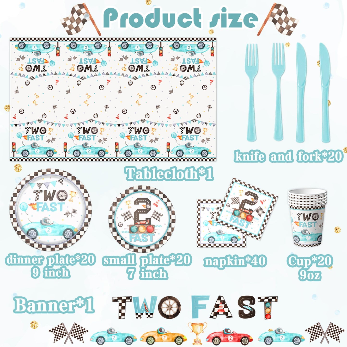 - Q: What is included in the 142pcs Two Fast Birthday Party Tableware set? A: The set includes 1pc 'Two Fast' banner, a race car tablecloth, 40 disposable paper plates in 2 sizes, 20 paper cups, 40 napkins, 20 knives, and 20 forks, catering to the needs of 20 guests.