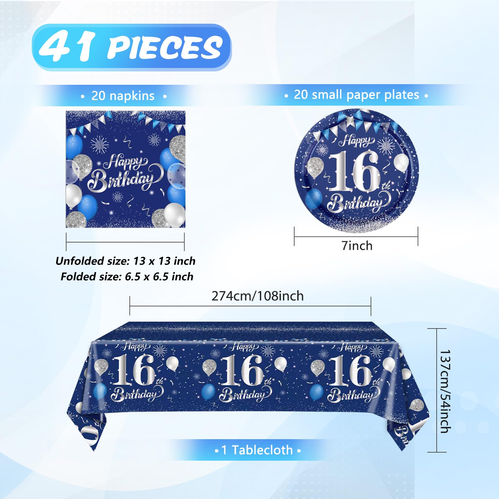• Q: What items are included in the 41PCS 16th birthday decorations set? A: The set includes 20 blue party plates, 20 blue party napkins, and 1 blue party tablecloth, all designed to create a festive atmosphere for a 16th birthday celebration.