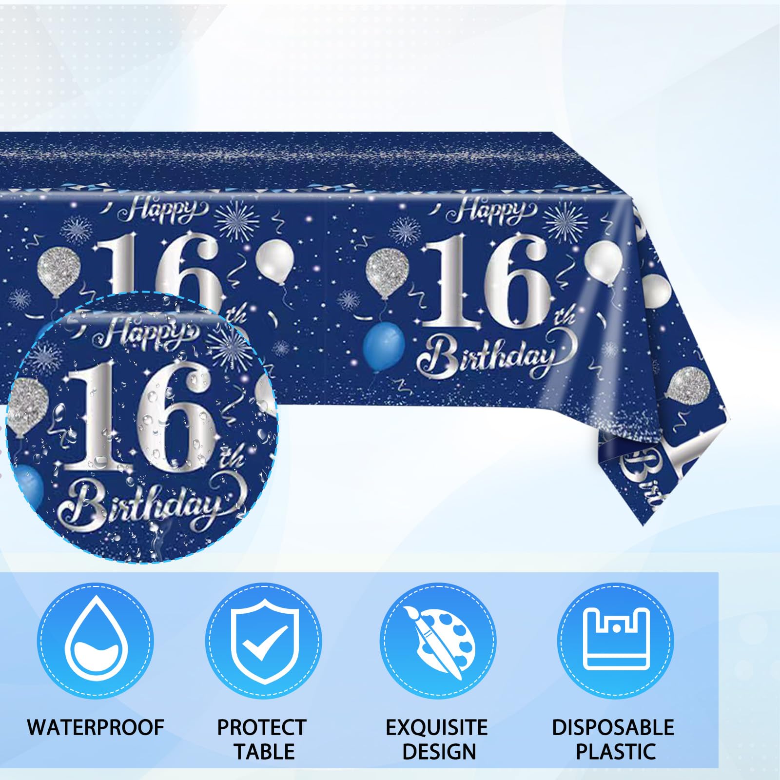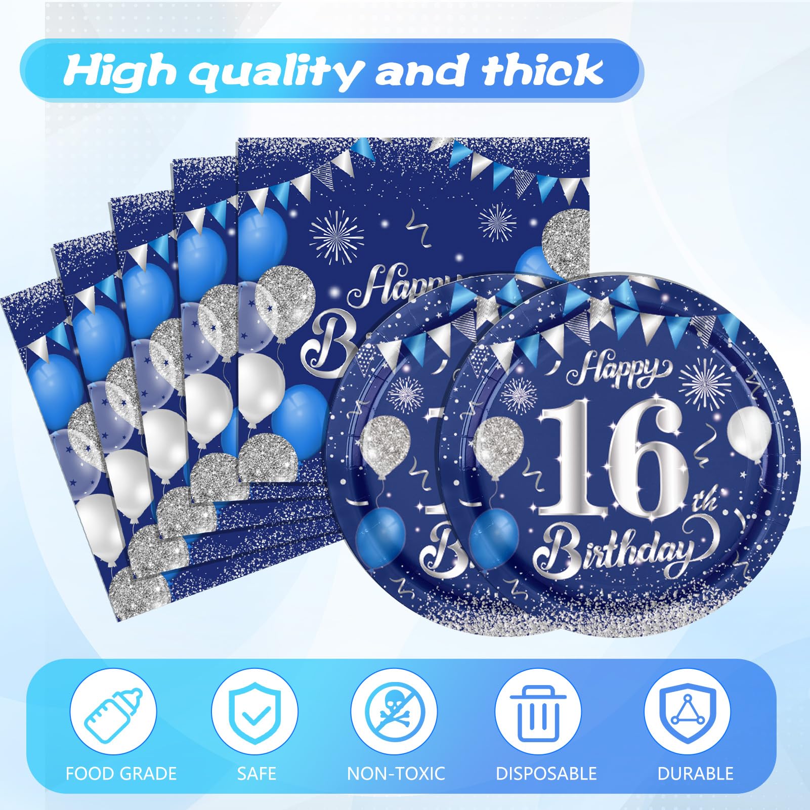 ?Why Choose Us:? Product Innovation: Make Every Party An Unforgettable And Beautiful Memory In Your Life. Our Brand Goal: To Provide You And Your Guests With Differentiated, Fashionable And Simple Party Decoration Supplies. The Purpose Of Everyone Holding A Party Is To Get Happiness And Surprise From It, So Each Of Our Designers Designs Products With This Goal In Mind, And They Are All People Who Love Life. ?A Happy Year Starts With Blue And Silver 16Th Birthday Party Decorations? Your 16Th Birthday Is The Most Important Day In Your 16 Years. We Hope That You Can Have A Very Happy Day And It Will Be The Beginning Of Countless Happy Days In The Future. The Stylish And Romantic Navy Blue And Silver Party Decorations Not Only Create A Happy Atmosphere For Your Birthday Party, But Also Give You More Time To Create Happiness Because It Is A One-Time Party Supplies. ?Package Includes:? 20 Pieces X Blue Party Plates 20 Pieces X Blue Party Napkins 1 Piece X Blue Party Tablecloth ?Warm Note:? 1.Please Allow Measurement Error Of About 1-2Mm. 2. There May Be Slight Color Difference Due To Different Monitors. 3. Do Not Microwave The Paper Plates.