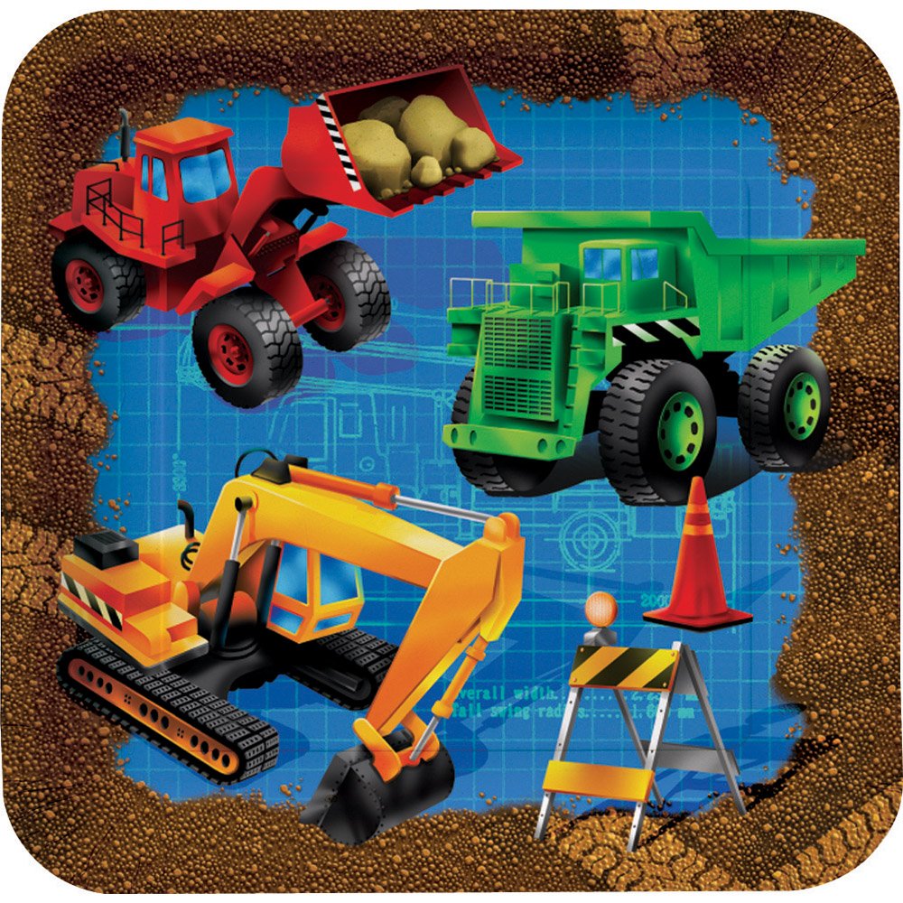 Construct the best birthday ever with the Under Construction Square Dessert Paper Plates. The plates feature a big excavator, giant dump truck and a front loader. Guests will 'dig' it when you add to your party decor with coordinating party tableware.