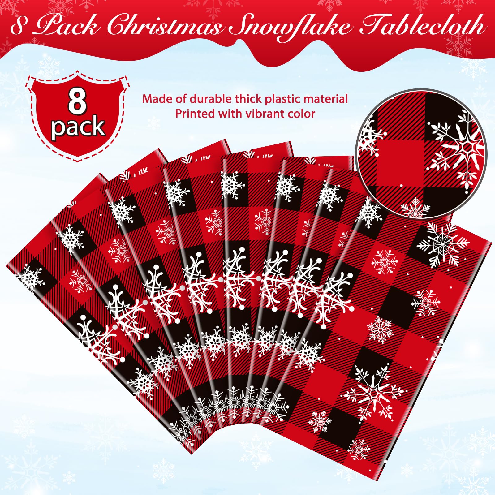 8 Pieces red and black buffalo plaid Merry Christmas party tablecloth decorations,plastic white snowflake buffalo plaid sign table cover for winter Christmas holiday party supplies,54x108 inch Extra large size: These buffalo plaid snowflake Christmas party tablecloth measures approx. 137x274cm/54X108 inch, which fits for 8 feet long tables that can accommodate 8-10 people, Its large enough for your to hold a winter holiday and Christmas theme party with your family and friends to share happiness Durable material: Made of quality thick plastic material, which is non-toxic and safe for kids and adults; Meanwhile, the tablecloths are lightweight , Waterproof ,Spill-proof Stain Resistant, they can effectively keep your tables clean, and can protect your tables from scratches Easy to clean: The white snowflake Christmas table cover printed with bright red and black checkered patter ,it has a smooth surface, you just need to wipe the table cover to clean it, then store it for next time or just toss it away,its great value for saving your time for cleaning after parties or decorate during the parties Wide application: These red and black buffalo plaid snowflake table covers are suitable for both indoor and outdoor use, you can hang them up on doors or walls for use as decorative backdrops or put them across the room as banners, easy to clean up after parties. Or just toss them away or simply wipe down and store for next time. Package includes: 8 x Plastic buffalo plaid snowflake Christmas tablecloth Warm note: Manual measurement, please allow slight errors on size. The colors may exist slight difference due to different screens.