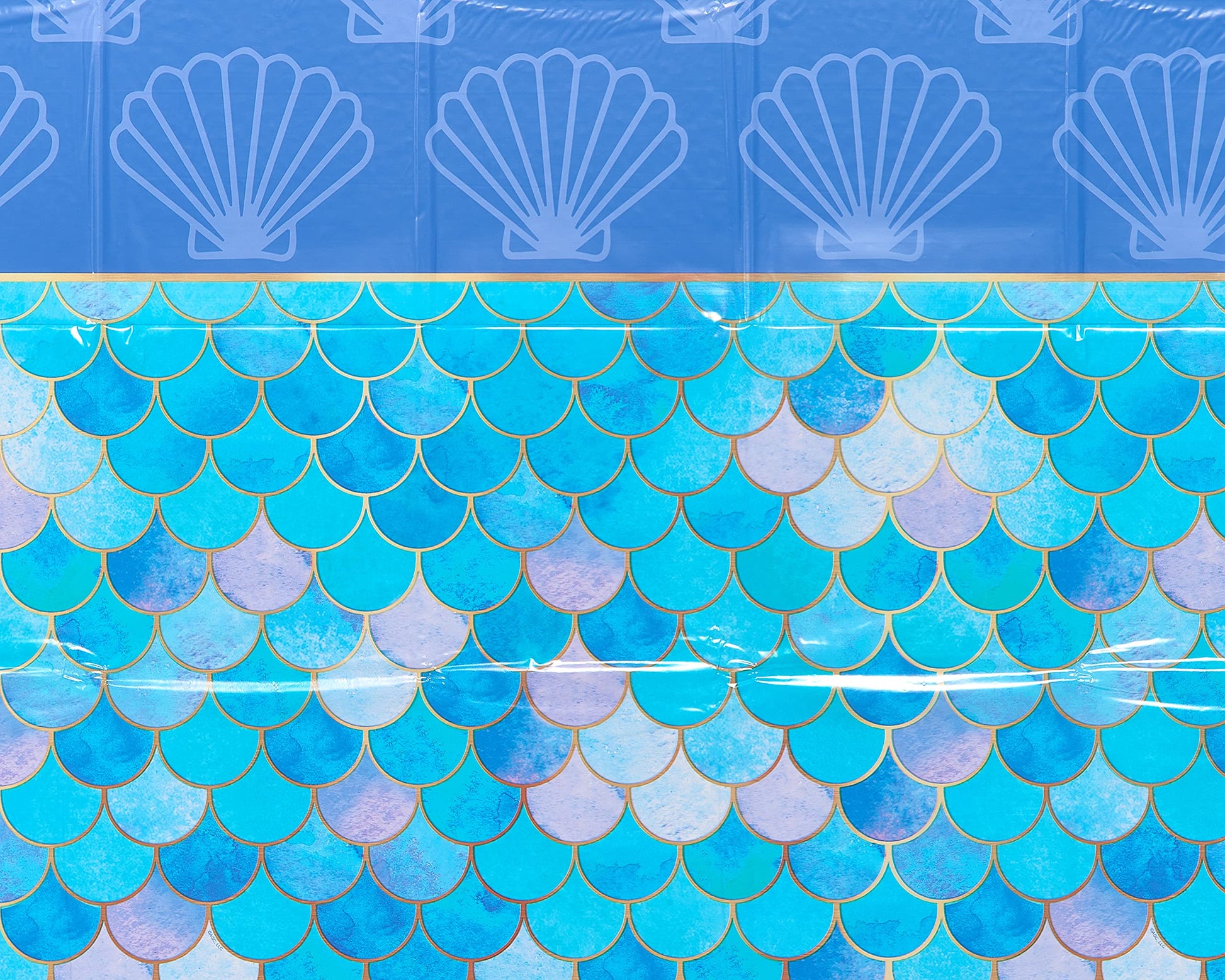- Q: What are the dimensions of the American Greetings Mermaid Table Covers? A: Each plastic table cover measures 54 inches by 84 inches, providing a total coverage area of 94.5 square feet for all three covers.