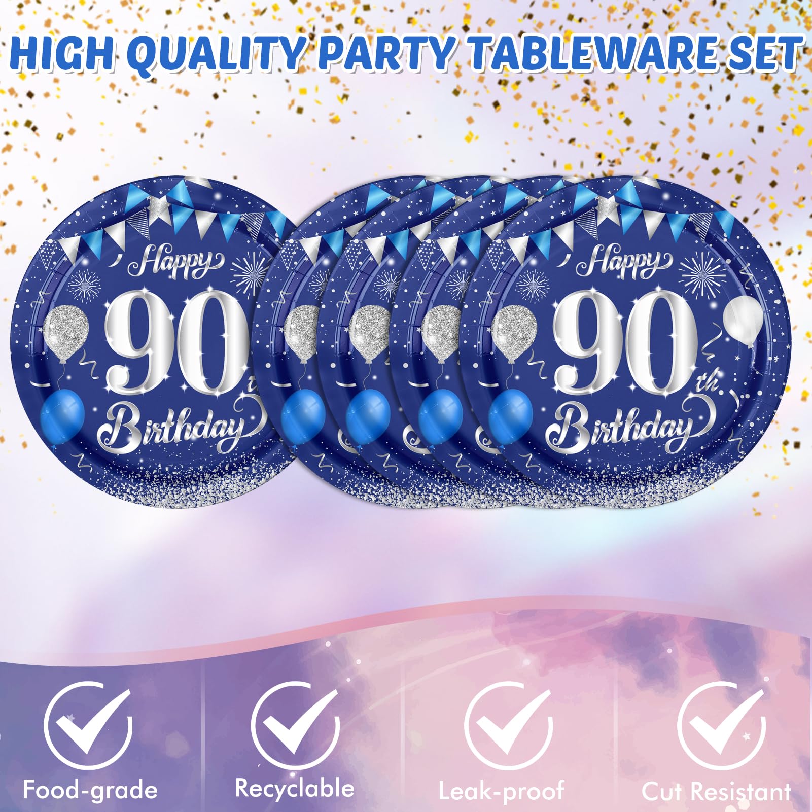Blue 90Th Birthday Decorations For Men Navy Blue Silver Happy 90Th Birthday Tableware Set Include Happy 90Th Birthday Plates Nap