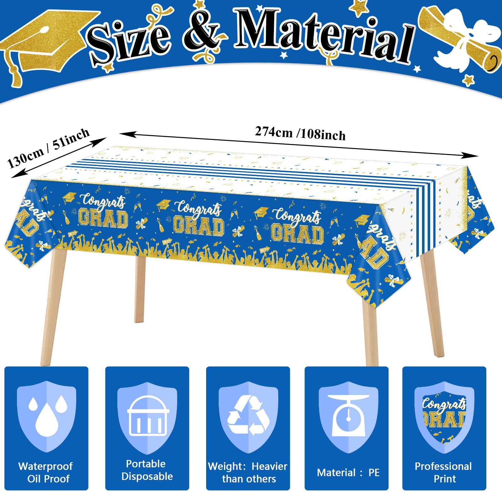 • Q: How many tablecloths are included in one package? A: Each package includes 3 pieces of blue and gold graduation tablecloths, allowing you to easily decorate multiple tables for your celebration.