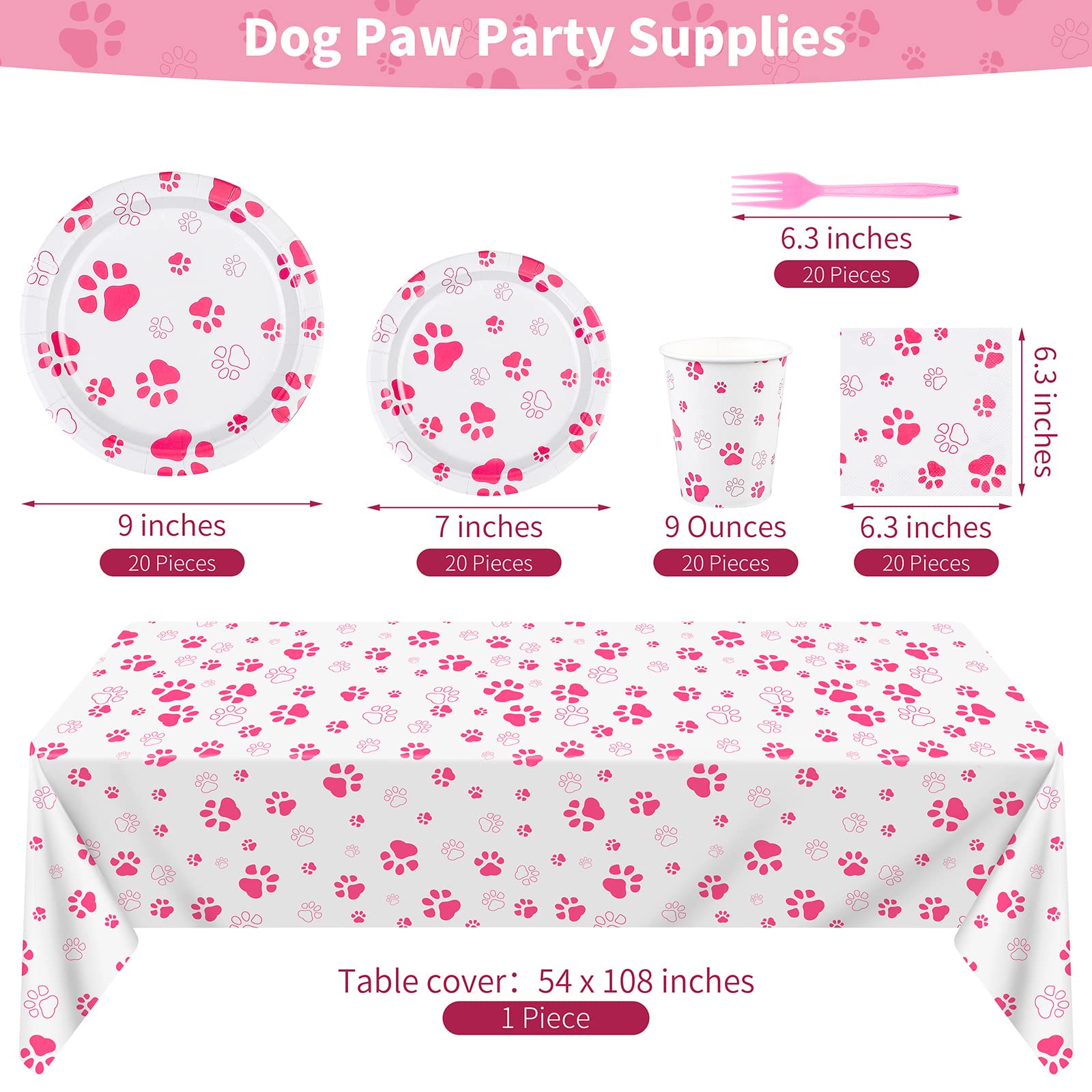 Durony 121 Pieces Pink Paw Print Party Supplies Dog Birthday Tablecloth, Plates, Napkins, Forks And Paper Cups Decorations For P