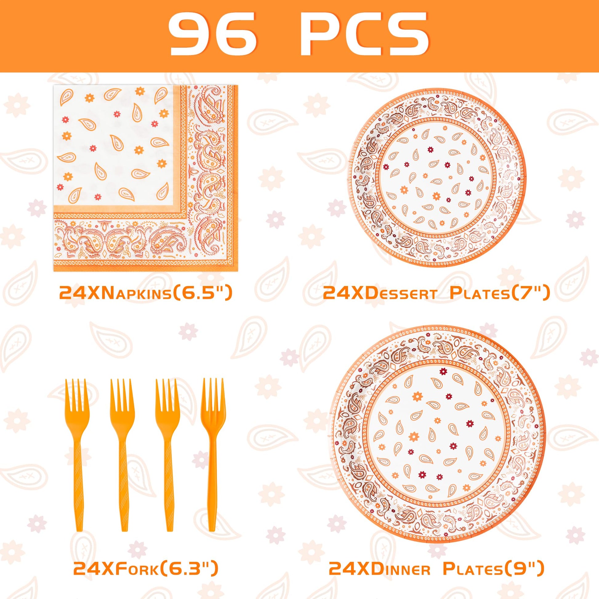 K1Tpde Cholo Bandana Party Tableware - 96Pcs Cholo Gangsta Theme Orange Paper Plates Set Disposable Dinnerware Paper Napkins Forks For Western Cowboy Birthday Party Supplies Decorations