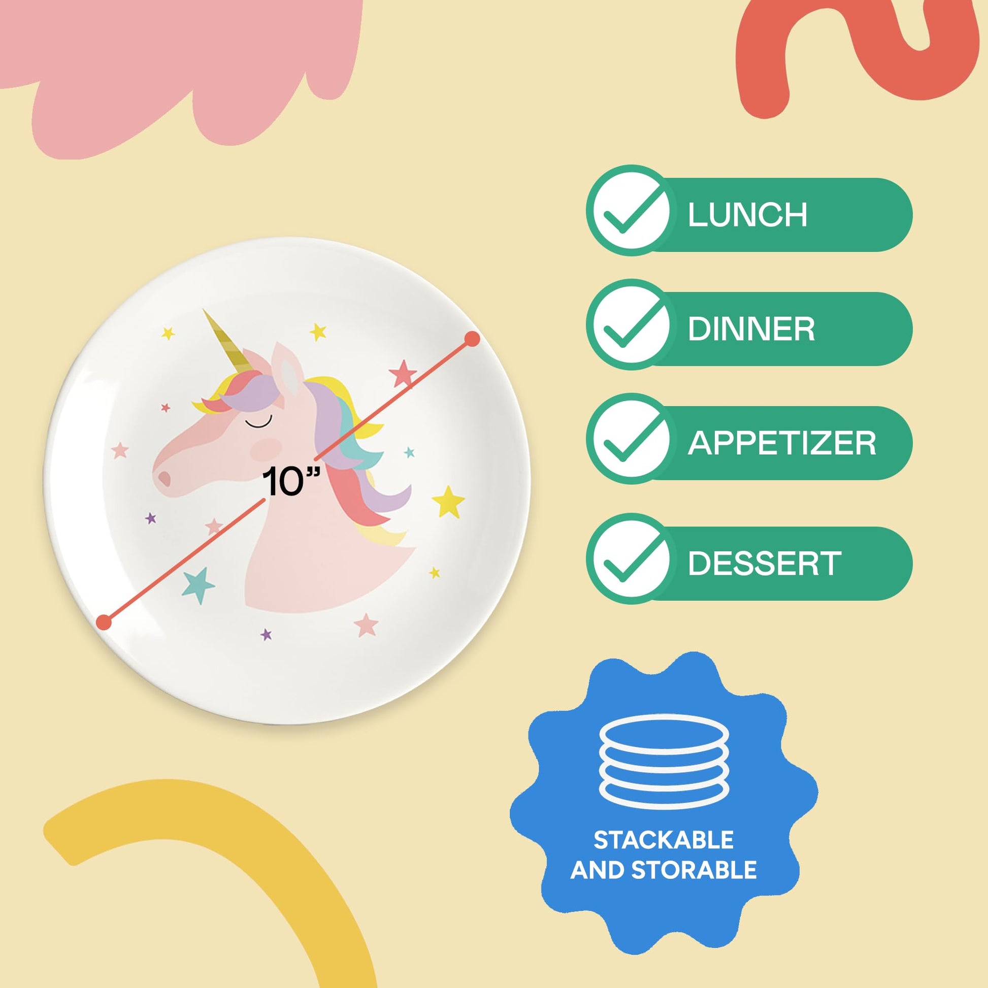Make every meal magical with our Unicorn Plate Set of 4, beautifully illustrated with playful unicorns and vibrant rainbows. Designed to inspire imagination and joy, these delightful 10-inch plates are ideal for breakfast, lunch, or dinner-perfectly sized for snacks and hearty meals alike. Crafted from durable, lightweight, and unbreakable melamine, each plate provides worry-free use whether indoors or outdoors. Thoughtfully packaged in a charming gift box, this unicorn dinnerware set makes a memorable and cherished gift for birthdays, celebrations, or special occasions. With BPA-free materials ensuring safe and worry-free meals, you can confidently serve breakfast pancakes, lunchtime sandwiches, or evening treats. Cleanup is easy, too-simply place them on the dishwashers top rack, and youre ready for the next enchanting meal. Durable, practical, and irresistibly adorable, these unicorn plates are destined to become a beloved part of your daily routine.