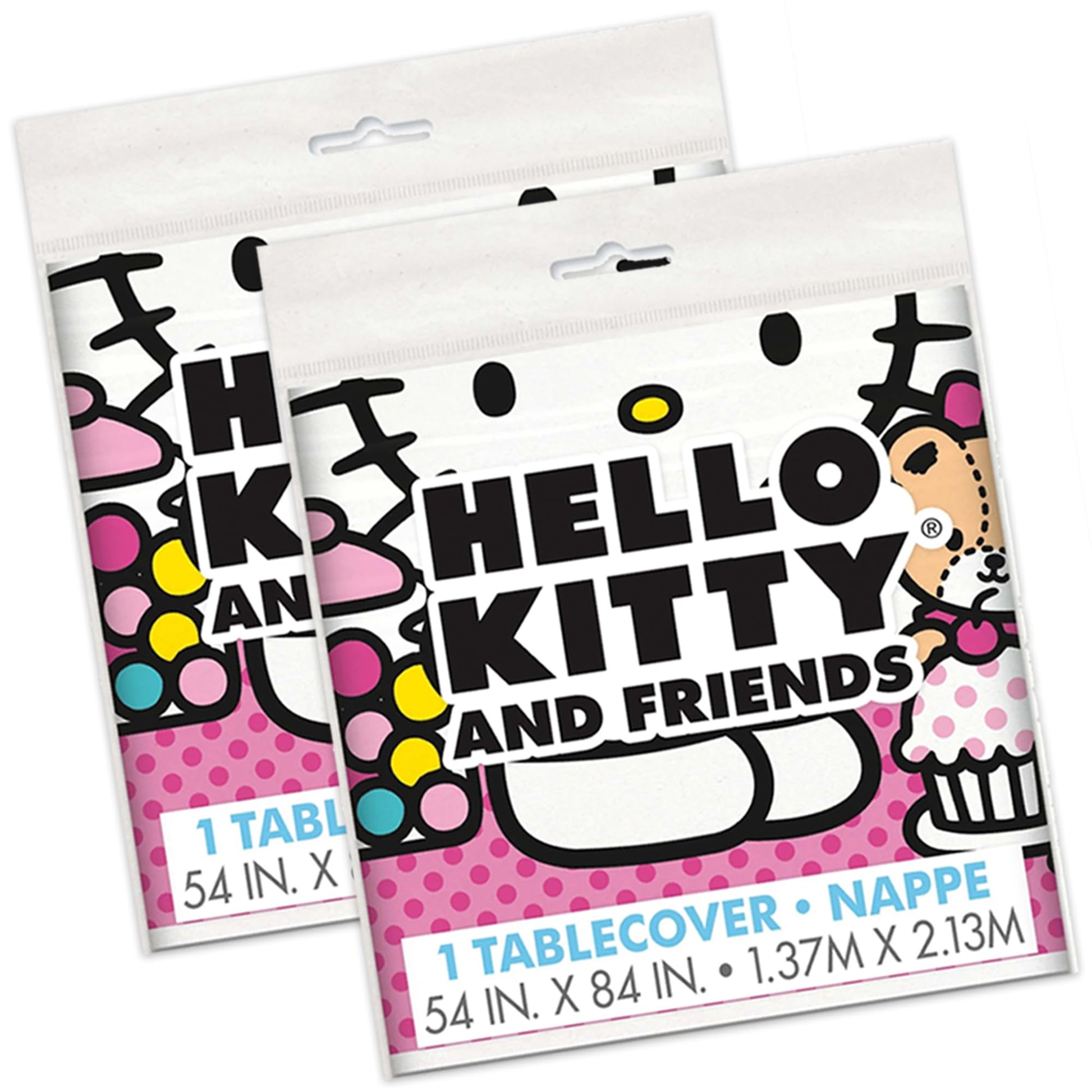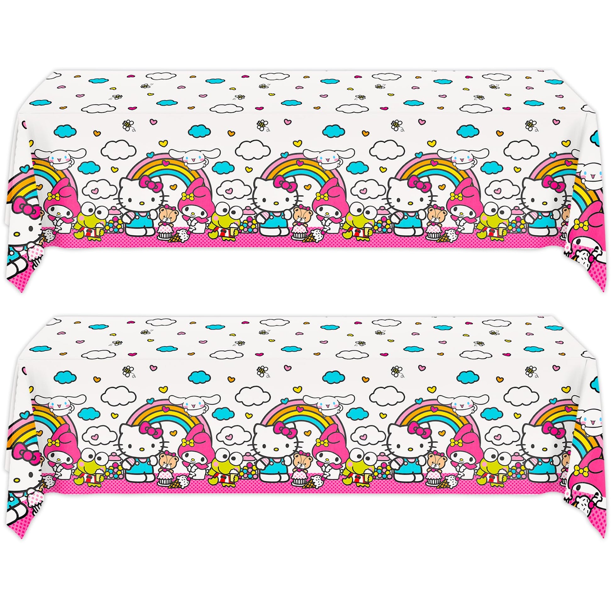 - Q: What colors are available for the Hello Kitty tablecloths? A: The Hello Kitty tablecloths feature a delightful design in white and pink, perfectly complementing any Hello Kitty themed birthday party.