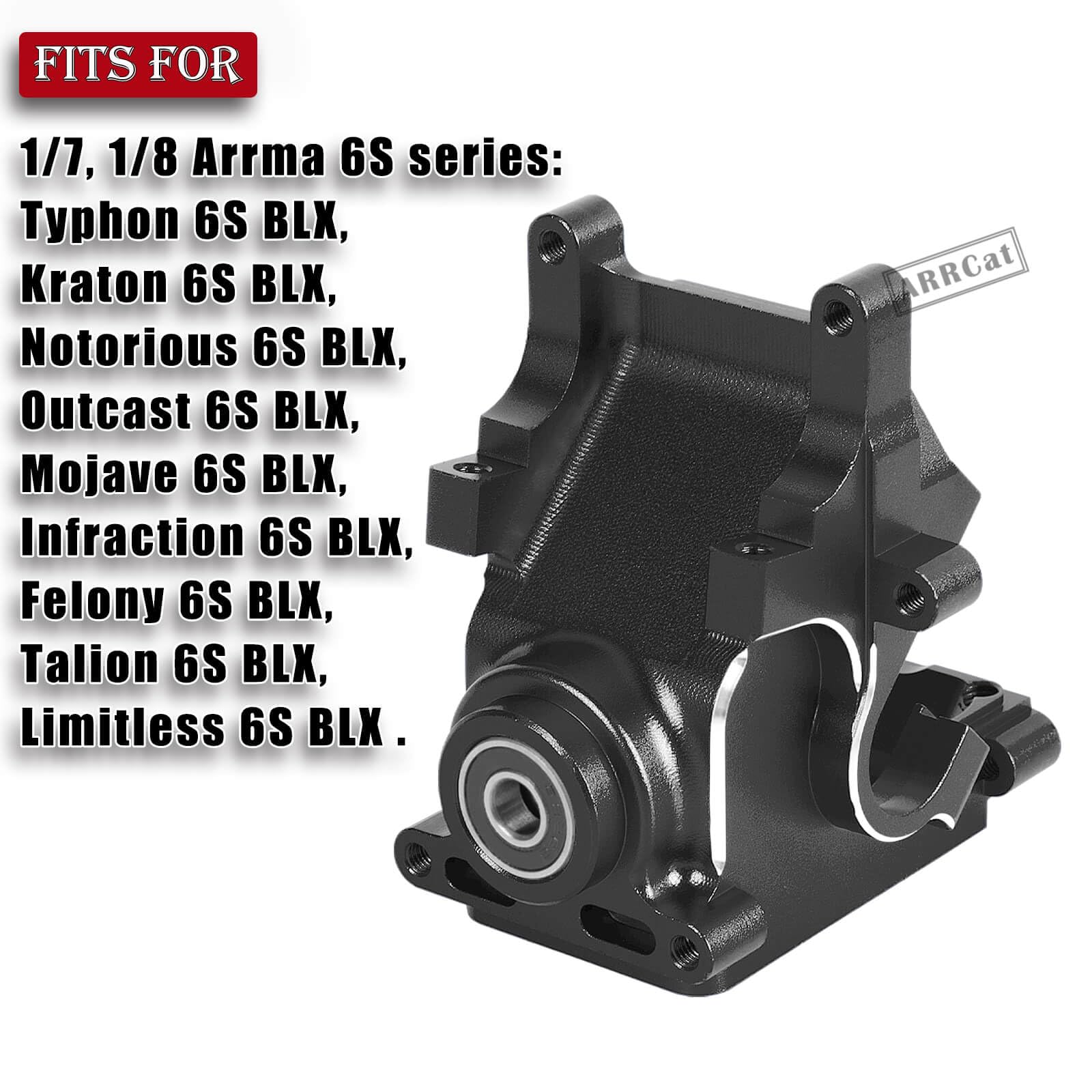 - Q: What RC car models are compatible with the Aluminum Gearbox Case? A: This Aluminum Gearbox Case is designed to replace the original FRONT or REAR Aluminum Gearbox Case for 1/7 and 1/8 ARRMA 6S series models, including Typhon 6S BLX, Kraton 6S BLX, Notorious 6S BLX, Outcast 6S BLX, Mojave 6S BLX, Infraction 6S BLX, Felony 6S BLX, and Talion 6S BLX.