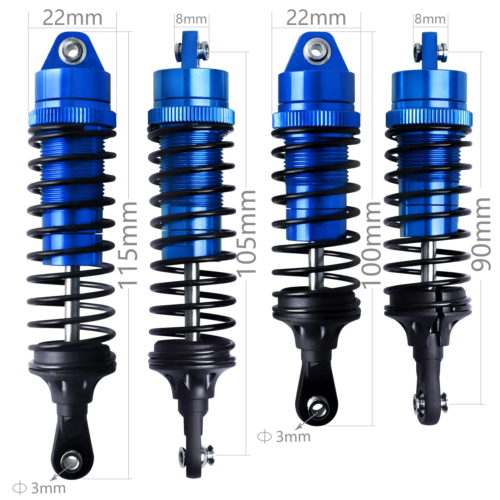 - Q: What are the dimensions of the front and rear shock absorbers? A: The set includes 2 alloy front shock absorbers with a total length of approximately 100mm and 2 alloy rear shock absorbers with a total length of approximately 115mm.