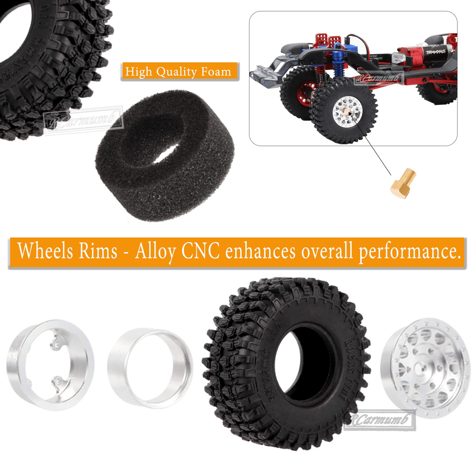 Rcarmumb RC Beadlock Wheel Tire Set with 10mm Hex Hub & Driveshafts CVD Upgrades Parts for 1/18 TRX4M,#45 Steel Front & Rear Drive Shafts,Tires Set & 10mm Extended Wheel Hex Hub Hop-Up,Silver