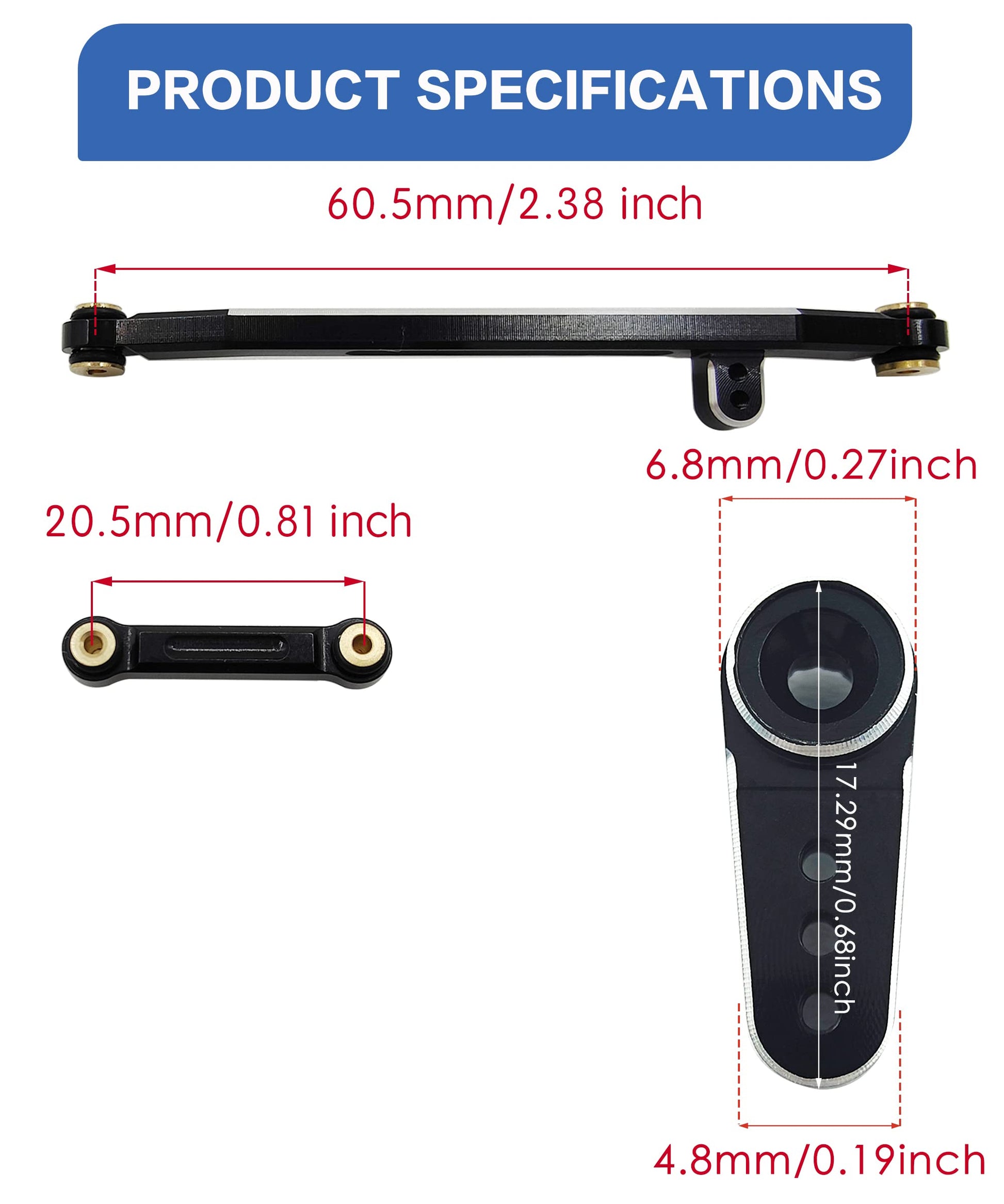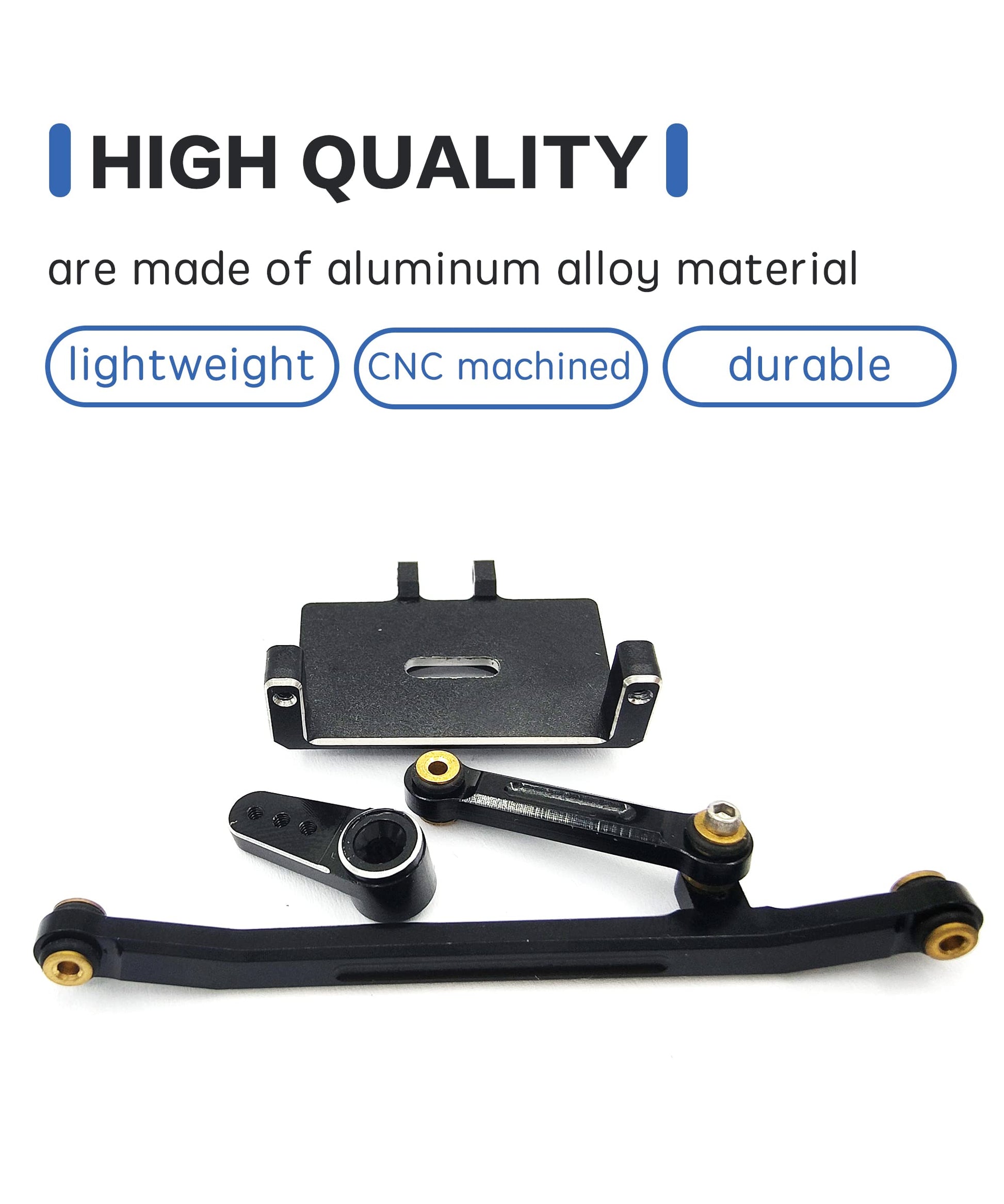 Key Features: Made of 6061-T6 aluminum, sturdy and durable, wear resistant CNC machined for high precision and strength Easy to install and remove, fit to the car perfectly The linkage set are much tighter than the stock steering linkage Small size and lightweight, easy to install Exquisite workmanship, compact structure RC Servo Horn Specification: Product Name: Servo arm ES08MA II(15T) Material: Aluminum alloy Color: Black Weight: 0.6g RC Servo Bracket Specification: Product Name: scx24 servo mount Material: Aluminum alloy Color: Black Steering Linkage Specification: Material: 6061-T6 aluminum Size: 60.5mm/2.38inch (long), 20.5mm/0.81inch (short) Package List: 1 X SCX24 servo horn 1 X SCX24 servo mount 1 Set x RC car steering links