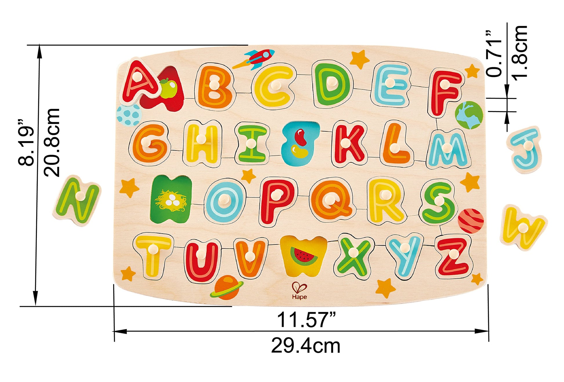 - Q: How does the Hape Alphabet Peg Puzzle help with early childhood development? A: This peg puzzle stimulates children through every stage of development by enhancing their fine motor skills, cognitive abilities, and problem-solving skills. The colorful design and engaging images encourage learning in a playful manner.
