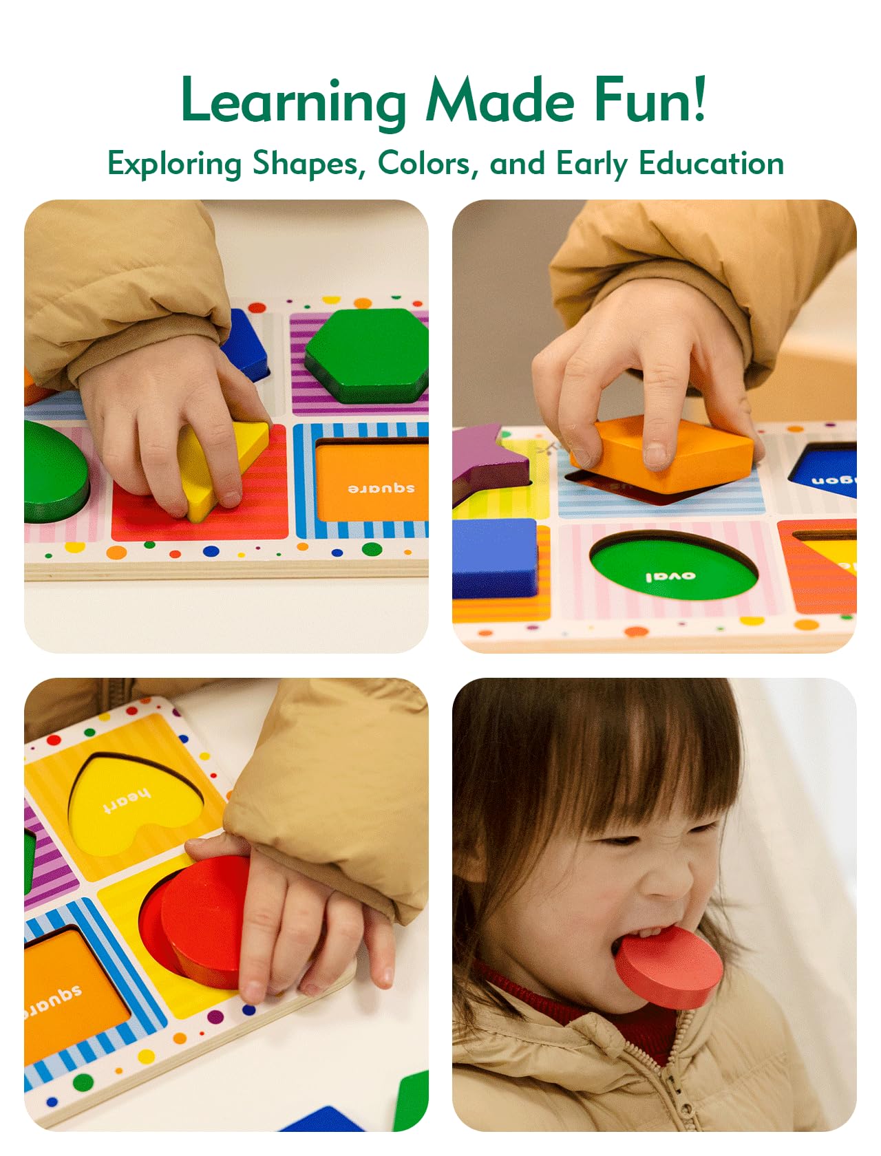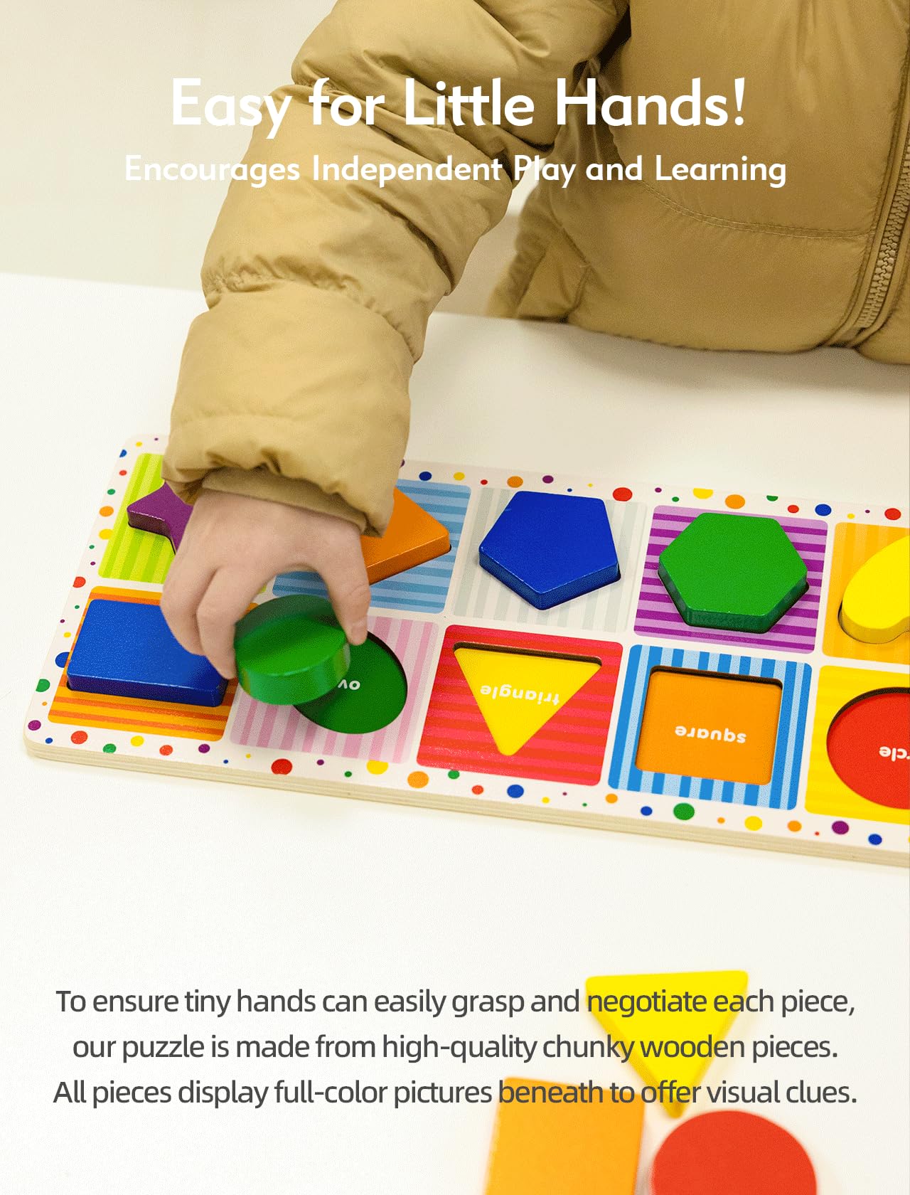 CHUNKY WOODEN PIECES: To ensure baby hands can easily grasp and negotiate each piece, our puzzle for kids is made from high-quality chunky wooden pieces. The pieces display full-color pictures beneath to offer visual clues.
